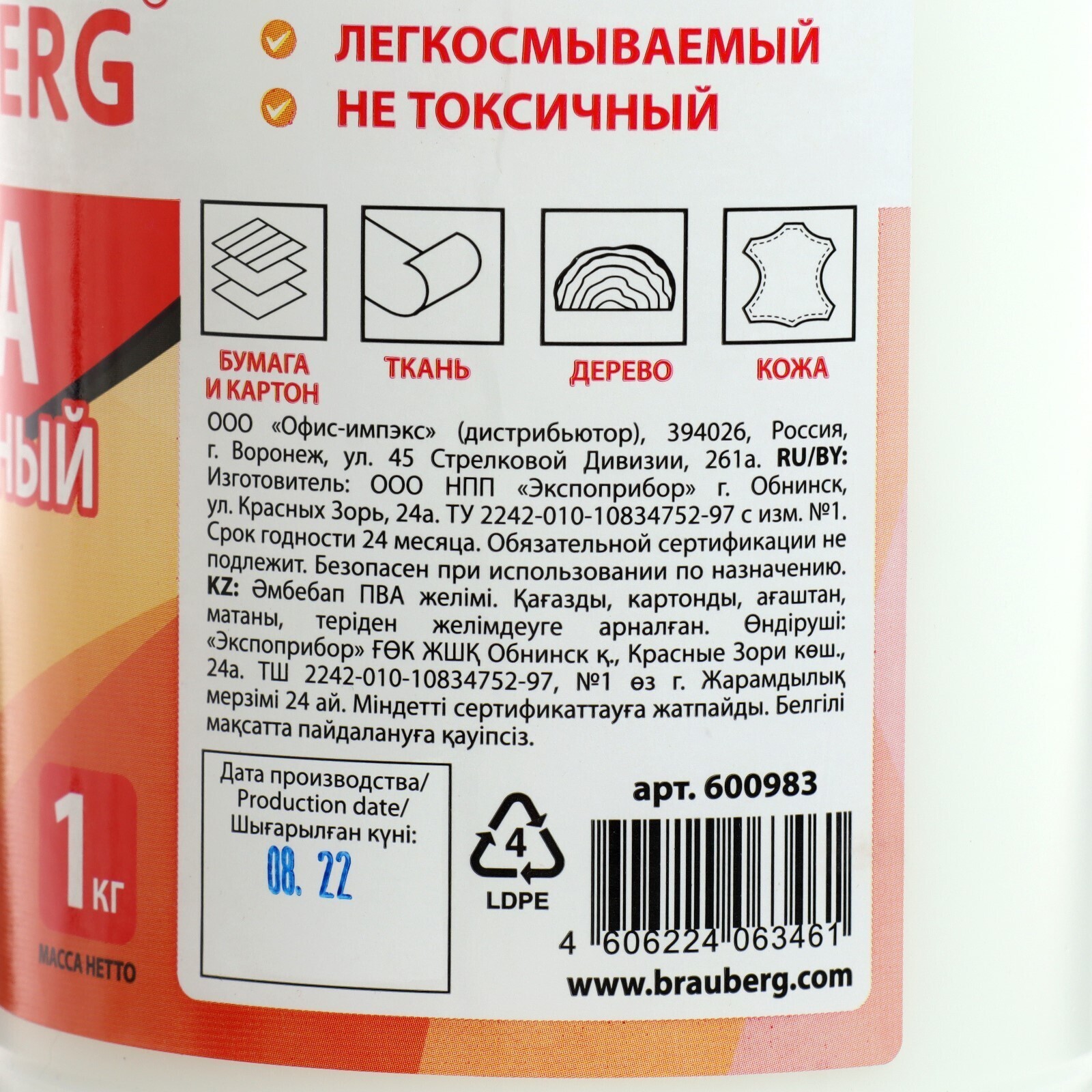 Клей PVA, 1 кг, BRAUBERG, универсальный