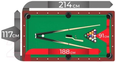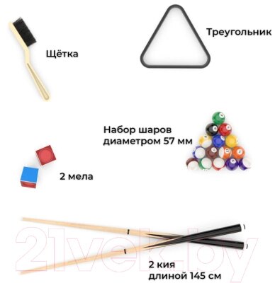 • Дополнительная комплектация щетка, треугольник, кубик для кия, кий, бильярдный шар