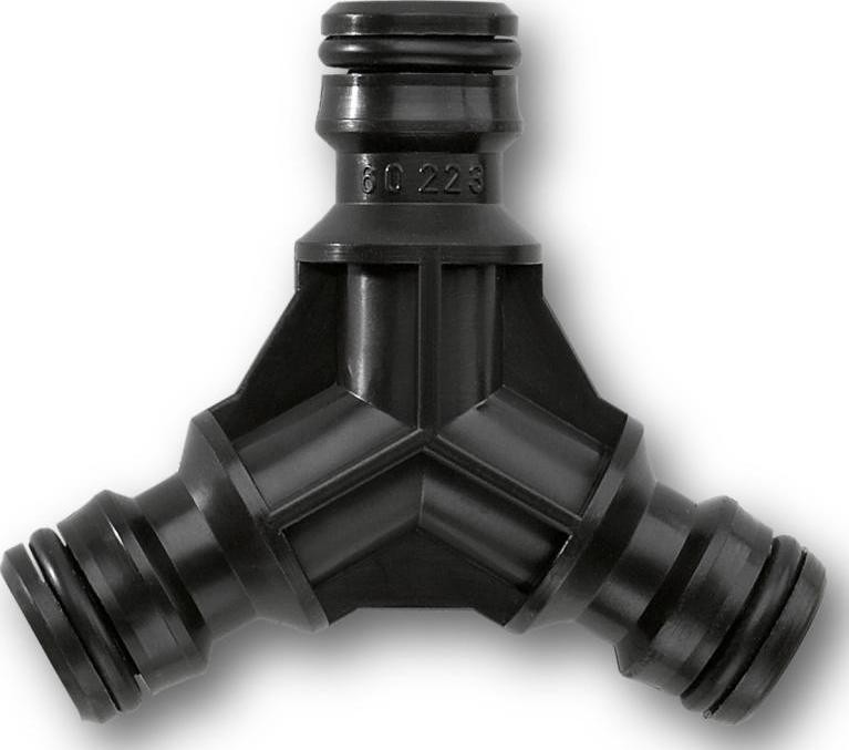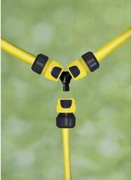 Тристоронній конектор для з'єднання двох шлангів. Цей високоякісний універсальний конектор підходить для всіх стандартних садових шлангів, має ергономічний дизайн, зручність у використанні. Тристоронній конектор сумісний із трьома найбільш широко використовуваними діаметрами шлангів і всіма доступними клік-системами.