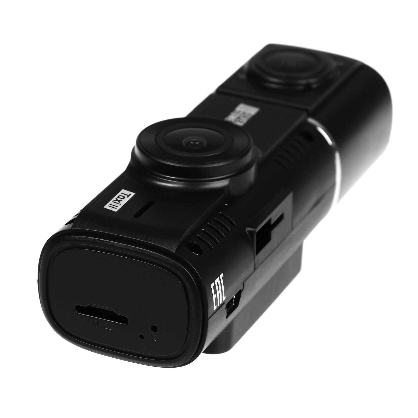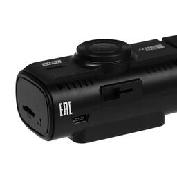 Двухканальное устройство, которое имеет возможность обрабатывать картинку сразу с двух камер. Основная камера, установленная на лобовом стекле, охватывает обзор всей дороги впереди. Вторая внутрисалонная камера фиксирует обстановку внутри ТС. Она вращается на 220° и оснащена инфракрасной подсветкой.
