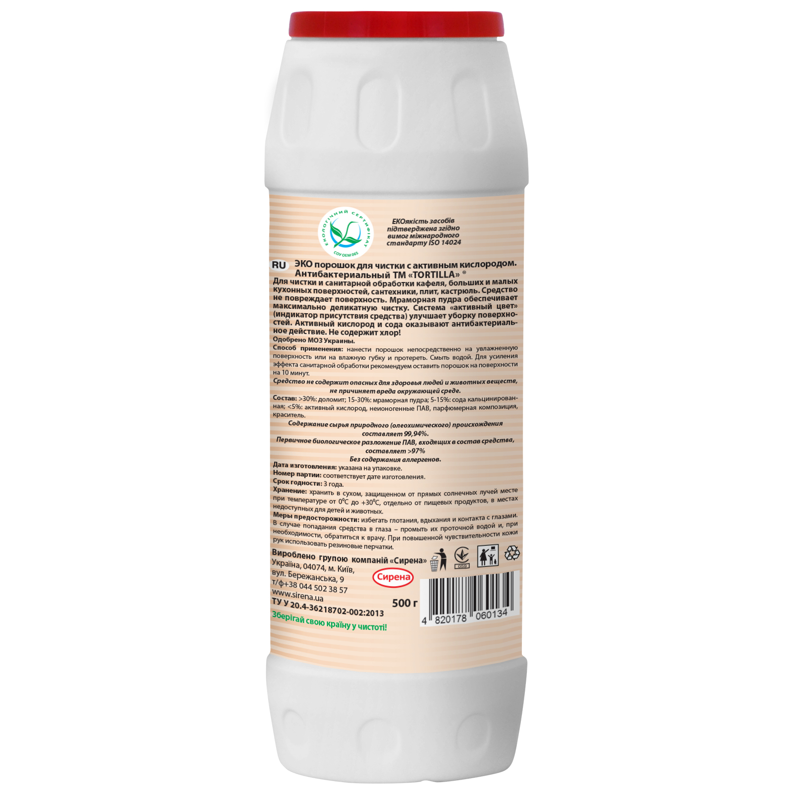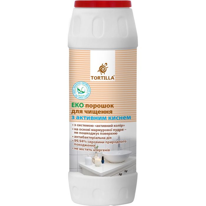 Екo порошок для чищення з активним киснем. Антибактеріальний "Тортила" для чищення та санітарного оброблення кахлю, великих і малих кухонних поверхонь, сантехніки, плит, каструль. Засіб не пошкоджує поверхню. Завдяки наявності в складі засобу мармурової пудри чищення поверхонь відбувається максимально делікатно. Система «активний колір» (індикатор наявності засобу) полегшує прибирання поверхонь. Активний кисень і сода надають антибактеріальну дію. Не містить хлору!