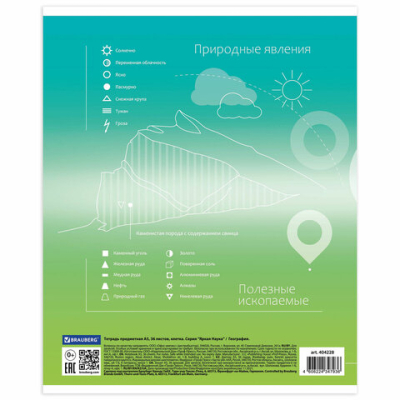 Тетрадь 36 листов "География", формат А5 (165х205 мм). Изготовлена из высококачественной офсетной бумаги плотностью 60 г/м2, белизной 100%. Листы соединены скобами. Линовка блока - в клетку, поля красные. Обложка выполнена из мелованной бумаги плотностью 170 г/м2. Подсказ по предмету отсутствует. Подсказ по предмету отсутствует.