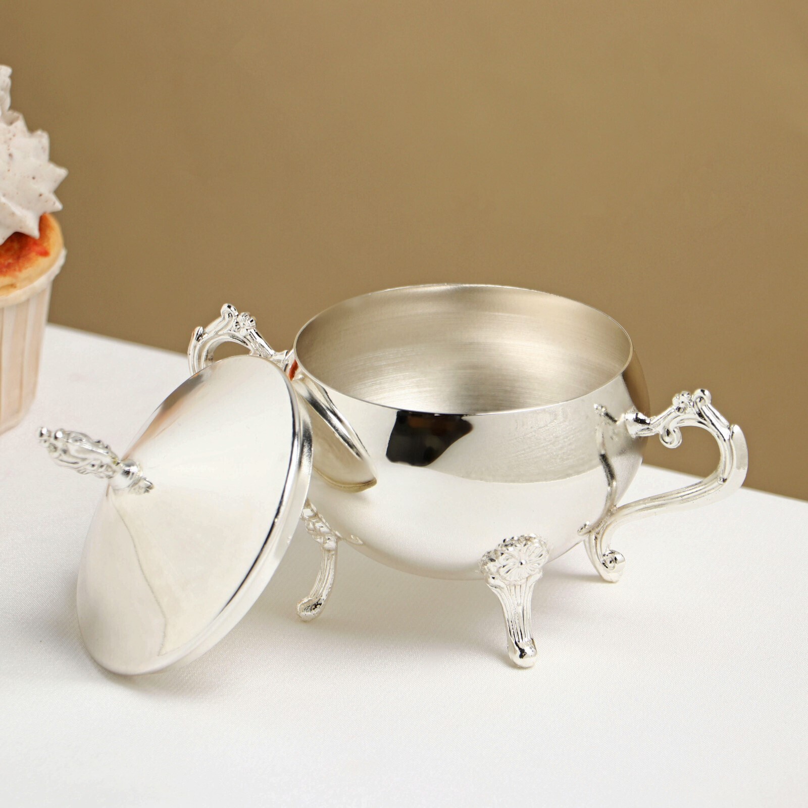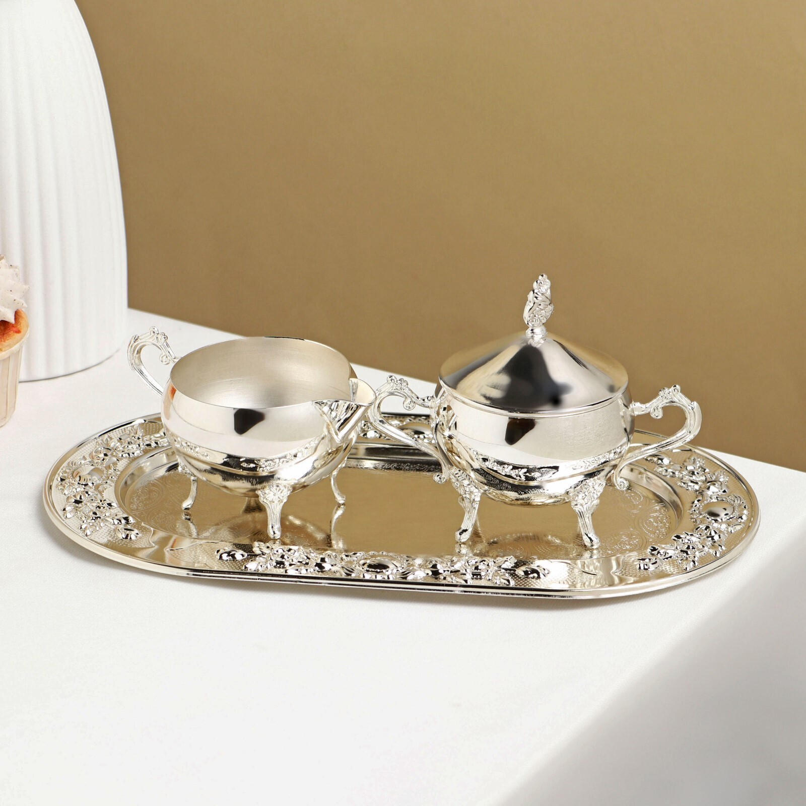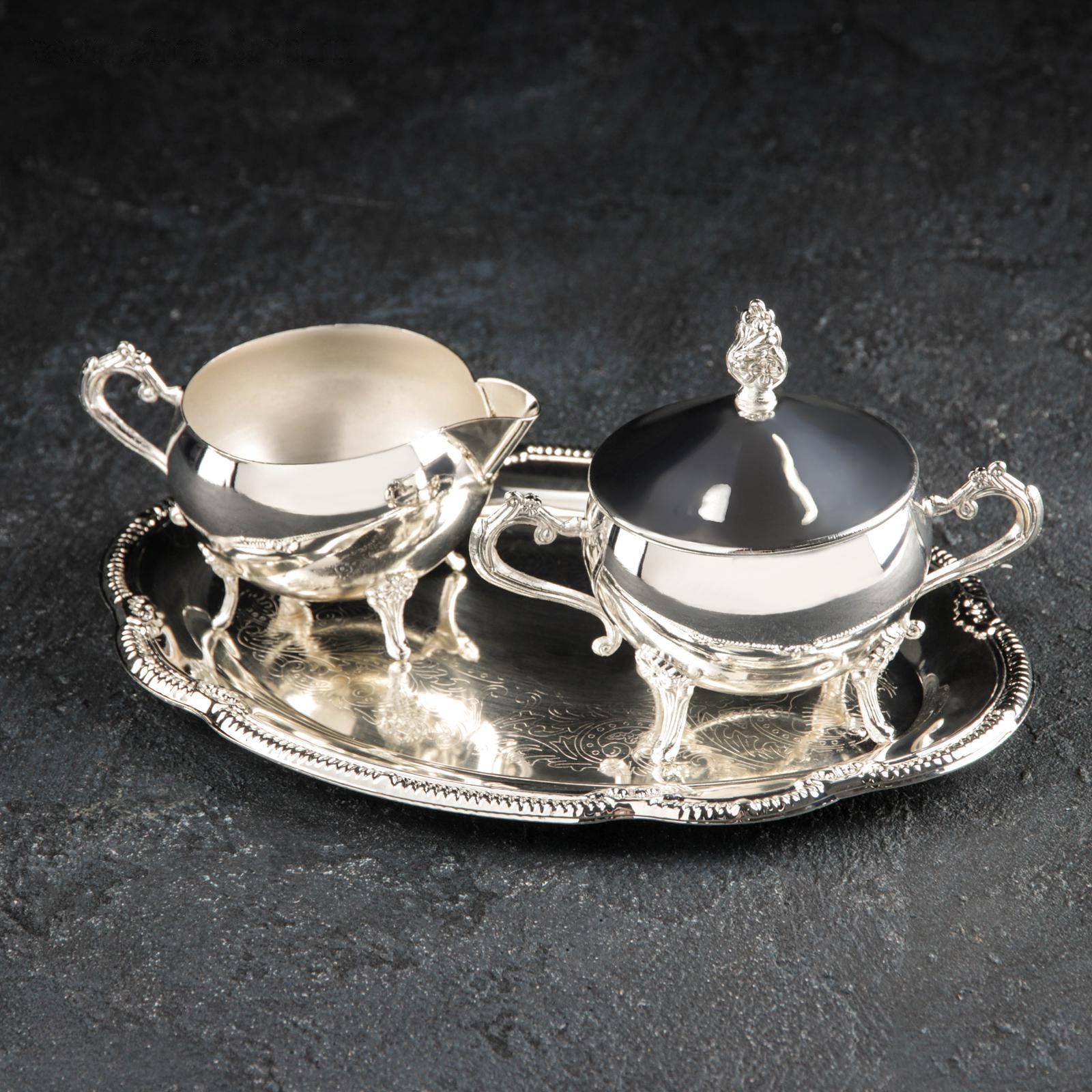 Набор сервировочный на подносе в стиле ампир изготовлен из качественного металла. Ёмкости на устойчивых ножках, сахарница имеет крышку и удобные изогнутые ручки. Молочник оснащён носиком, поэтому жидкость не прольётся.