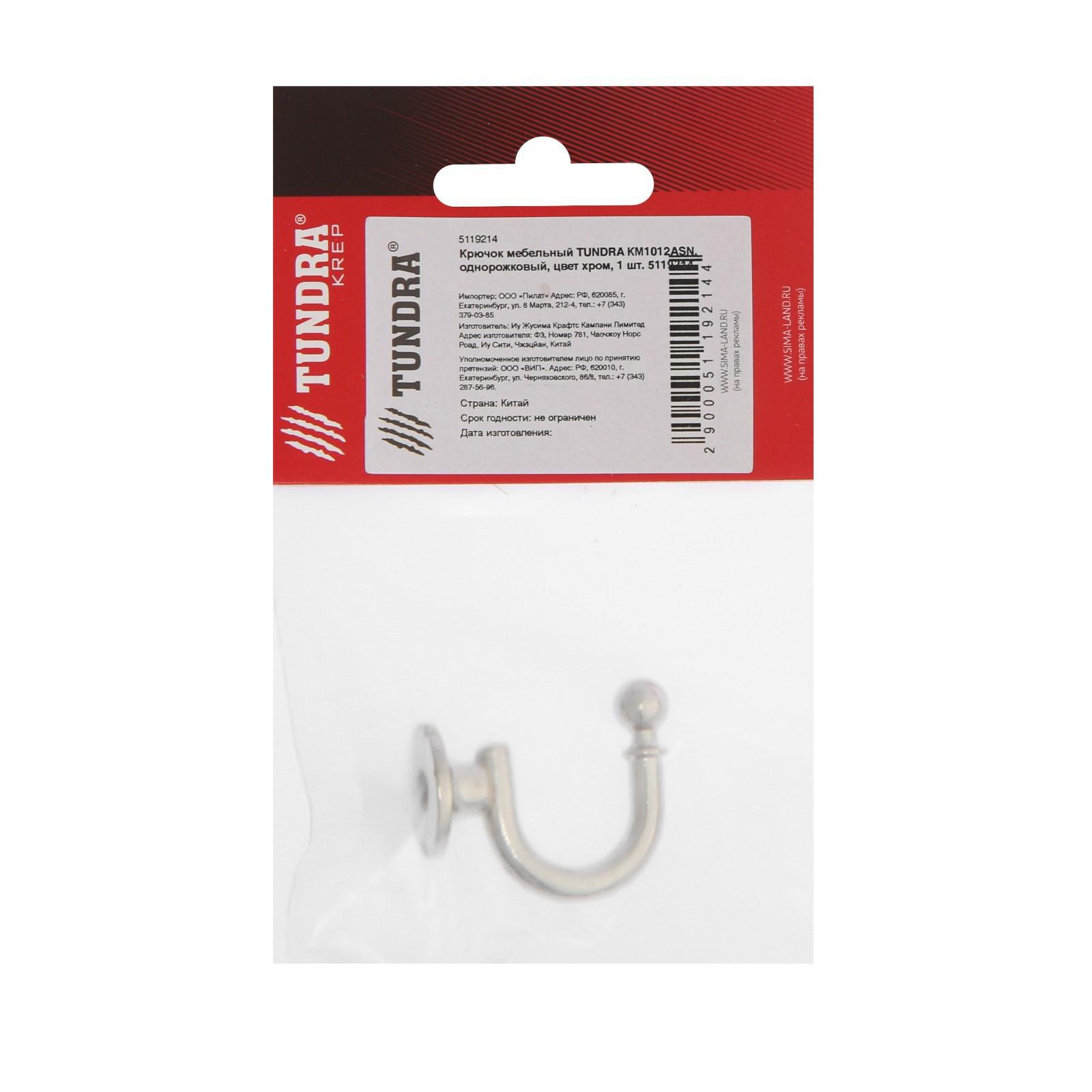 Крючок мебельный ТУНДРА КМ1012ASN, однорожковый, цвет хром, 1 шт.