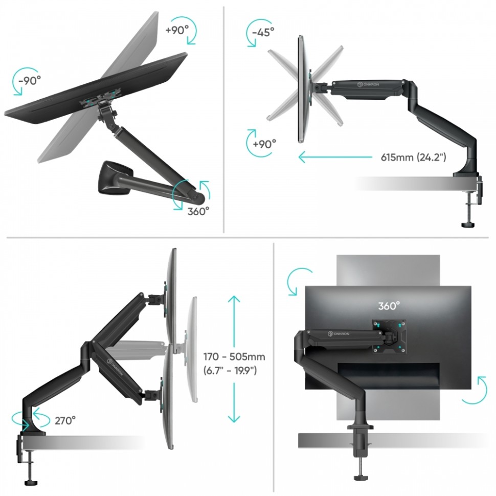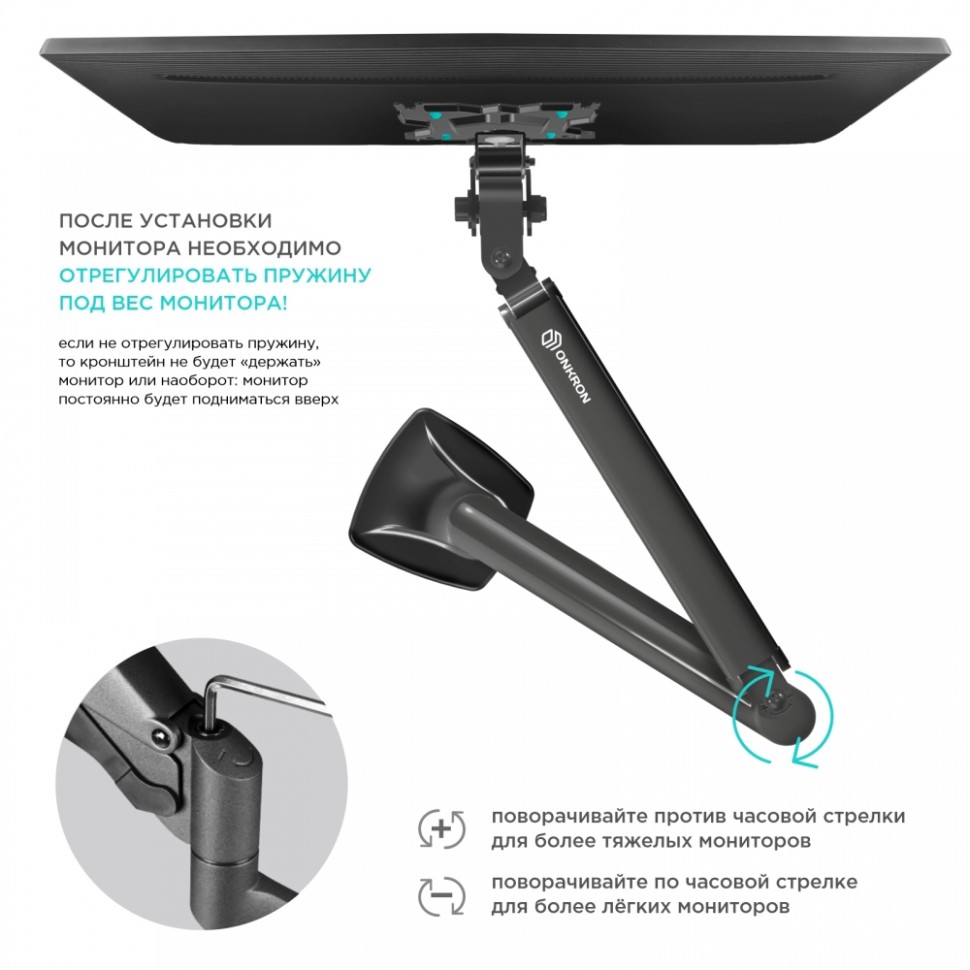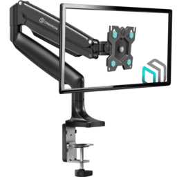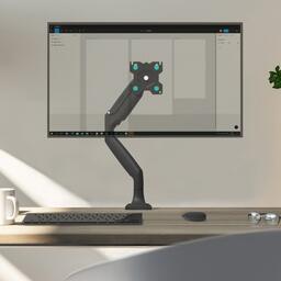 Настольный кронштейн для монитора, выполненный по технологии газлифт, ONKRON G100 подходит для мониторов и телевизоров диагональю от 13 до 32 дюймов (33,02 – 81,28 см) и весом до 9 кг. Механизм с возвратной пружиной и газовым амортизатором, располагающийся внутри корпуса кронштейна, даст возможность легко перемещать монитор в любую нужную вам позицию. Настольное крепление для монитора ONKRON G100 поможет Вам оптимально организовать пространство и освободить место для документов и офисного оборудования на компьютерном столе. Этот стильный держатель станет хорошим решением для вашего дома или офиса. Сложный технический процесс изготовления газовой пружины, качественные клапаны и износостойкая сталь цилиндра пружины в совокупности обеспечивают максимизацию преимуществ и удобств для пользователя, а именно: - плавную регулировку положения монитора без рывков и отскоков, - устойчивость в установленном положении независимо от веса монитора, - значительный ресурс газовой пружины, рассчитанный минимум на 50.000 нагрузочных циклов. Настольный кронштейн G100 поддерживает стандарты крепления VESA 75x75mm и 100x100mm. Встроенный в корпус кабель-канал позволит спрятать и зафиксировать провода для удобства и эстетичного внешнего вида. С углом наклона от -90 до +90 градусов можно максимально комфортным образом настроить монитор под индивидуальные параметры. Разместив его в нужной позиции относительно Вашего положения за столом, Вы сохраните правильную осанку и хорошее зрение. Вы можете повернуть монитор вокруг своей оси на 270°. Это преимущество позволяет с легкостью регулировать углы обзора и делать просмотр доступным из любой точки помещения. Кронштейн можно установить через отверстие в столе. Надежное крепление на столе для тех, кто нашел идеальное место для своего монитора.