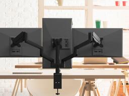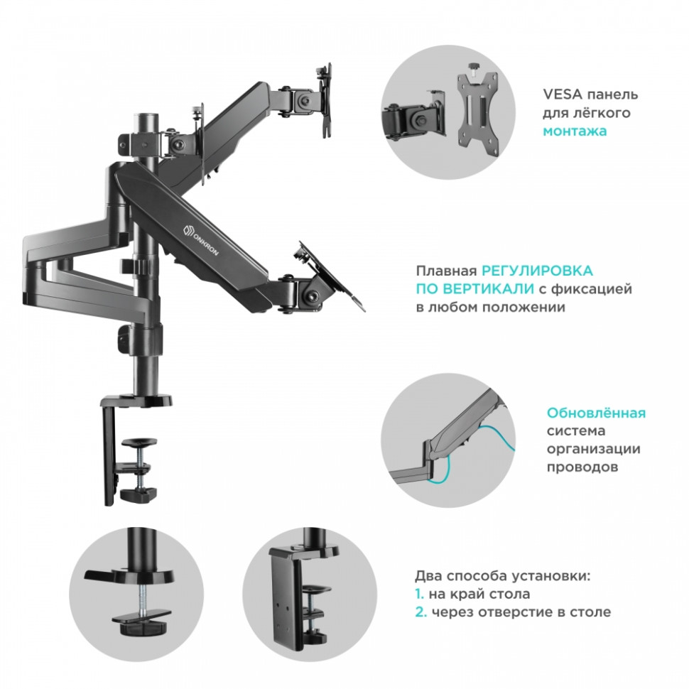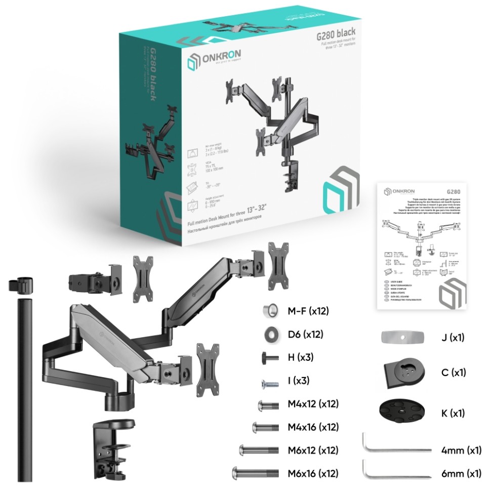 Профессиональный кронштейн Onkron G280 для трех панелей – отличное решение для дома и офиса. Независимая регулировка каждого экрана позволяет вращать мониторы на 360°, наклонять их вверх и вниз, поворачивать влево и вправо, а также регулировать по высоте. Прочная конструкция подойдет для установки телевизоров или мониторов c диагональю от 13 до 32 дюймов и совокупным весом до 22 кг. Кронштейн универсален за счет нескольких предусмотренных производителем размеров VESA – 75x75 мм и 100x100 мм. Специальный механизм, предусмотренный конструкцией кронштейна, позволит сделать процесс установки мониторов более легким и быстрым. Встроенный в корпус кабель-канал позволит спрятать и зафиксировать провода для удобства и эстетичного внешнего вида Вашего устройства. С углом наклона от -35 до +35 градусов можно максимально комфортным образом настроить монитор под индивидуальные параметры. Разместив его в нужном положении относительно положения за столом, Вы сохраните правильную осанку и хорошее зрение. Вы можете повернуть монитор вокруг своей оси на 180°. Это преимущество позволяет с легкостью регулировать углы обзора и делать просмотр более доступным из любой точки помещения. Установка таким способом позволяет крепить кронштейн на край стола. Вы будете избавлены от необходимости делать дополнительные отверстия. Мягкие накладки защищают поверхность стола от возможных царапин. Кронштейн можно установить через отверстие в столе. Надежное крепление на столе для тех, кто нашел идеальное место для своего монитора.