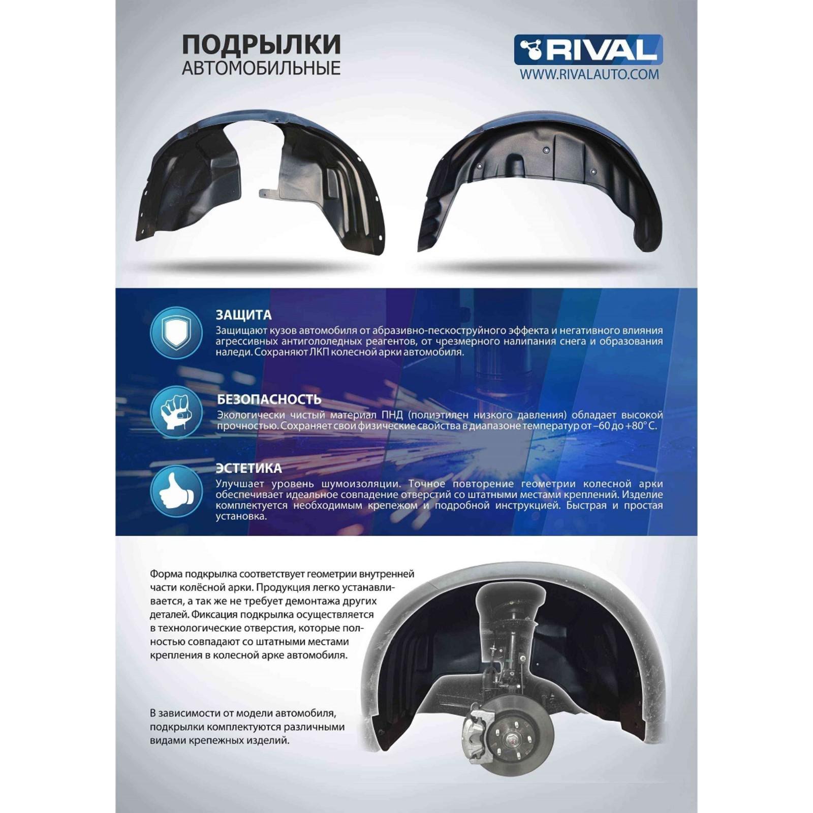 Подкрылок Rival надёжно защищает кузовные элементы авто от пескоструйного эффекта, агрессивных реагентов, чрезмерного налипания снега и образования наледи. Изделие выполнено из ПНД (полиэтилен низкого давления) - ударопрочный и износостойкий материал, способствующий дополнительной шумоизоляции автомобиля. Подкрылок не препятствует движению колеса, повторяя контур колёсной арки автомобиля. Легко устанавливается в штатные места крепления и не требует дополнительного сверления.