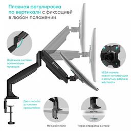Обращаем внимание, что при выборе кронштейна необходимо ориентироваться на несколько параметров: стандарт VESA (расстояние между крепежными отверстиями), диагональ экрана, вес ТВ и нагрузка на кронштейн. Международная компания ONKRON является одним из лидеров на мировом рынке стоек, кронштейнов и держателей для телевизоров, мониторов, проекторов и оборудования для установки видеостен. Мы предлагаем: - высококачественный и функциональный продукт, - техническую и информационную поддержку, - гарантию 5 лет. ONKRON G200 – стильный настольный кронштейн для одного монитора. Он подходит для большинства компьютерных мониторов весом до 9 кг с диагональю от 13 до 32 дюймов, под самые распространенные крепления стандарта VESA 75х75 и 100х100 мм. G200 оптимально организует ваше рабочее пространство, освободит место на компьютерном столе. G200 – кронштейн из новой и усовершенствованной линейки продуктов ONKRON с обновленным дизайном, усиленными ребрами жесткости крепежной пластины и фирменными лазурными полимерными накладками, предотвращающими механическое трение стального кронштейна об установленный монитор. Механизм с возвратной пружиной и газовым амортизатором внутри корпуса кронштейна дает возможность легко и плавно перемещать монитор в любую нужную вам позицию. Предусмотрена опция разворота монитора до вертикального (портретного) положения – дополнительный бонус для дизайнеров и программистов. Кронштейн для мониторов ONKRON G200 создан для высокого стандарта качества жизни.