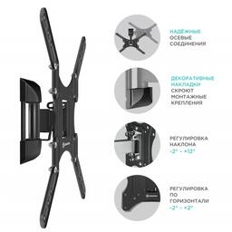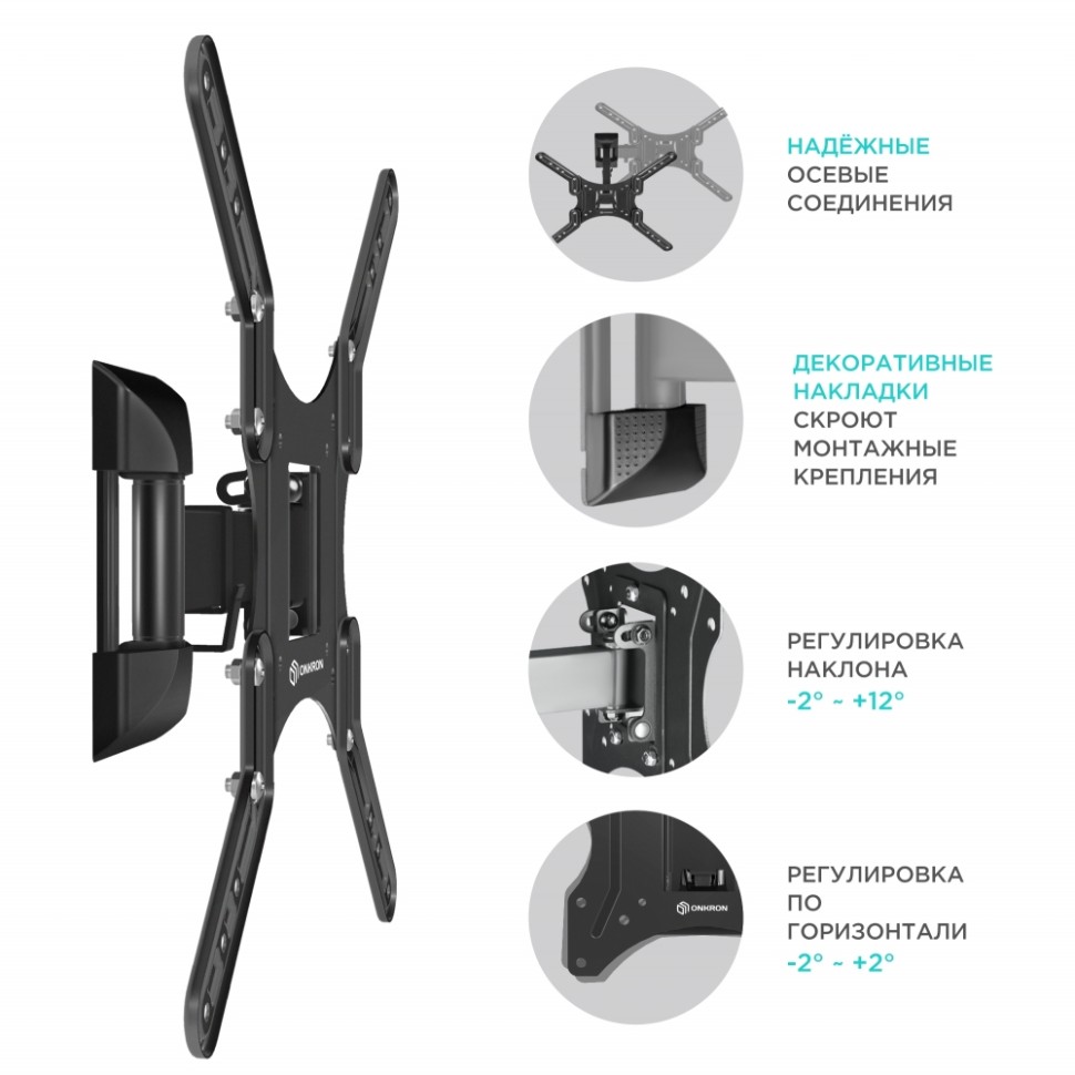 Настенный наклонно-поворотный кронштейн ONKRON M2 предназначен для ТВ с диагональю от 26 до 65 дюймов (66-165,1 см). Максимальный выдерживаемый вес составляет 35 кг. Кронштейн подходит для телевизоров средней и большой диагонали. Тонкий профиль (от 4 до 21 см) придает кронштейну аккуратный внешний вид. Также Вас порадуют широкие возможности регулировки кронштейна – производитель предусмотрел изменения наклона, поворота и корректировку экрана по горизонтали. Простая система установки и фиксации сэкономят Вам дополнительные силы и время. Кронштейн ONKRON M2 сделает просмотр телевизора максимально комфортным. Расширенная комплектация включает дополнительные VESA-адаптеры, позволяющие расширить диапазон размеров VESA – от 100x100 мм до 400x400 мм. Он обеспечивает возможность маневренного поворота кронштейна на угол до 80°. Для поворота телевизора Вам не нужно использовать дополнительных приспособлений или прилагать усилия. Вы сможете повернуть ТВ-панель и изменить расстояние от стены лёгким движением руки, при этом телевизор зафиксируется в настроенном положении. Предусмотренная производителем система держателей проводов позволит закрепить их в нужном положении - это придаст дополнительное удобство и сделает более аккуратным внешний вид Вашего устройства. Вы можете занимать любое удобное положение при просмотре телевизора за счет широких возможностей регулировки угла наклона. Эти возможности позволят получать удовольствие от просмотра. Также Вы сможете комфортно разместить ТВ и на большой высоте. Скроют всевозможные монтажные крепления, добавив эстетичности образу Вашего устройства. Кронштейн подходит для большинства телевизоров популярных брендов, среди которых Samsung, LG, Sony, KIVI, Tcl, Xiaomi Mi, SUPRA, Panasonic, Hyundai, Erisson, Asano, Horizont, JVC, Thomson, HARTENS, Sharp, Toshiba, Skyworth, BBK, AVEL, Витязь, Веко, BQ, DEXP, SkyLine, Pioneer, Rolsen, Harper, Hisense, Hitachi, Polarline, Prestigio, Telefunken и других.