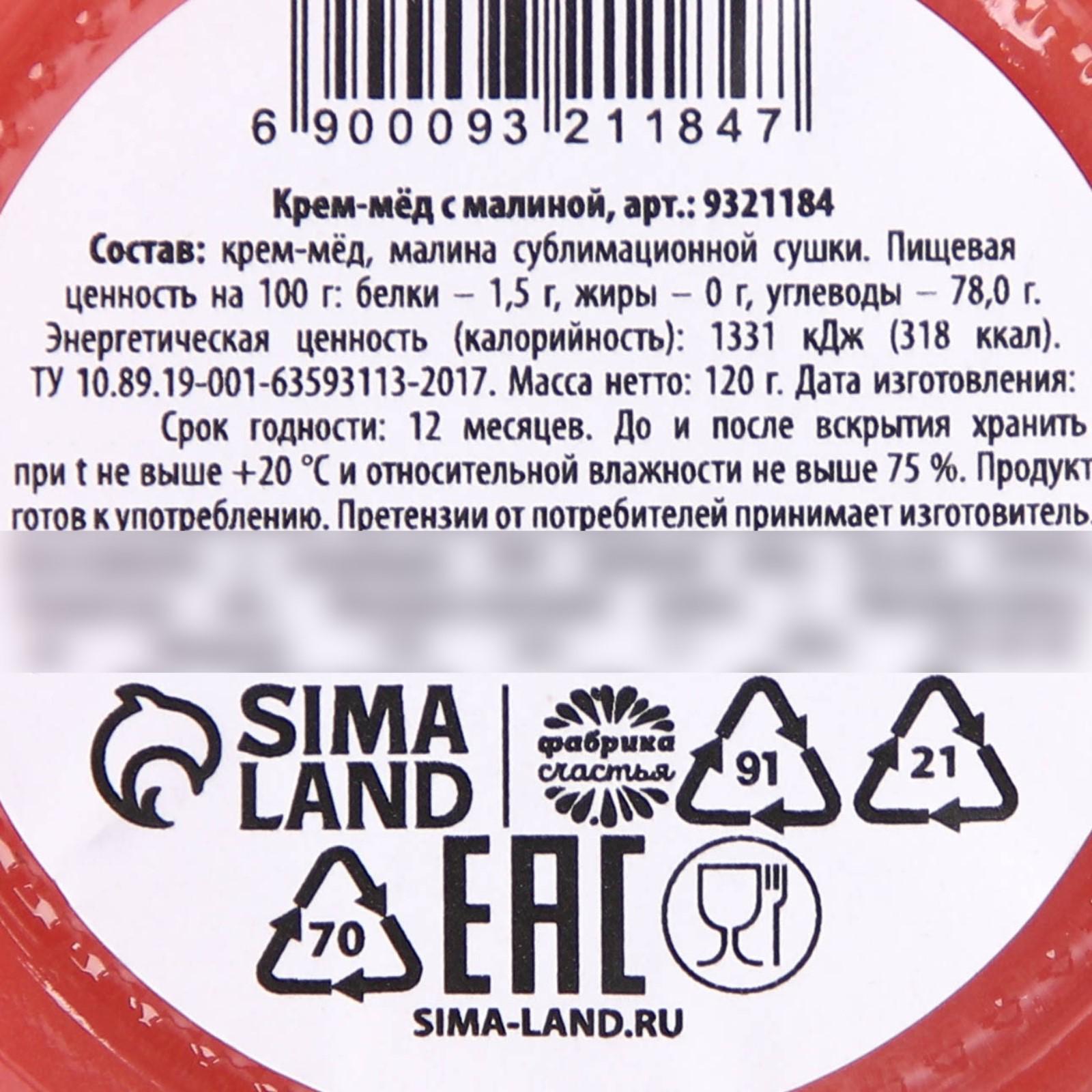 Состав: крем-мёд, малина сублимационной сушки. Масса нетто: 120 г. Срок годности: 12 месяцев.