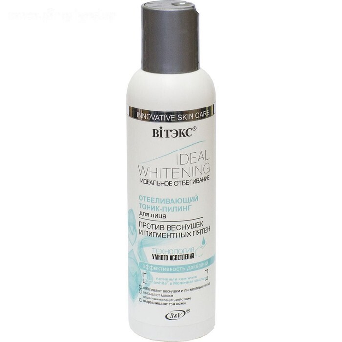Тоник-пилинг для лица ВITЭКС "Идеальное Отбеливание" выравнивает цвет кожи и минимизирует появление пигментных пятен. Благодаря уникальной технологии «умного» осветления компоненты глубоко проникают в кожу и прицельно воздействуют на участки, которым необходимо осветление. Активный комплекс Dermawhite® обеспечивает отбеливающий эффект, воздействуя на разные стадии процесса пигментации кожи, заметно осветляя веснушки и пигментные пятна. Молочная кислота оказывает мягкое отшелушивающее действие, стимулируя обновление кожи. Натуральный растительный экстракт толокнянки помогает снизить синтез меланина и минимизировать появление пигментных пятен.