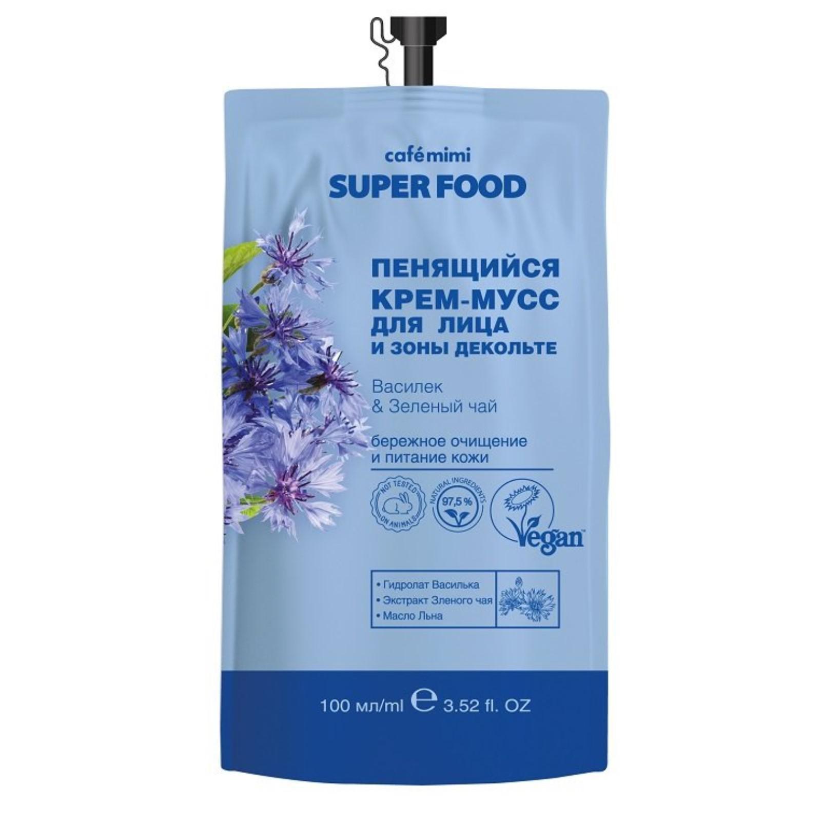 Пенящийся крем-мусс для лица, декольте Cafe Mimi Super Food, василек & зеленый чай, 100 мл