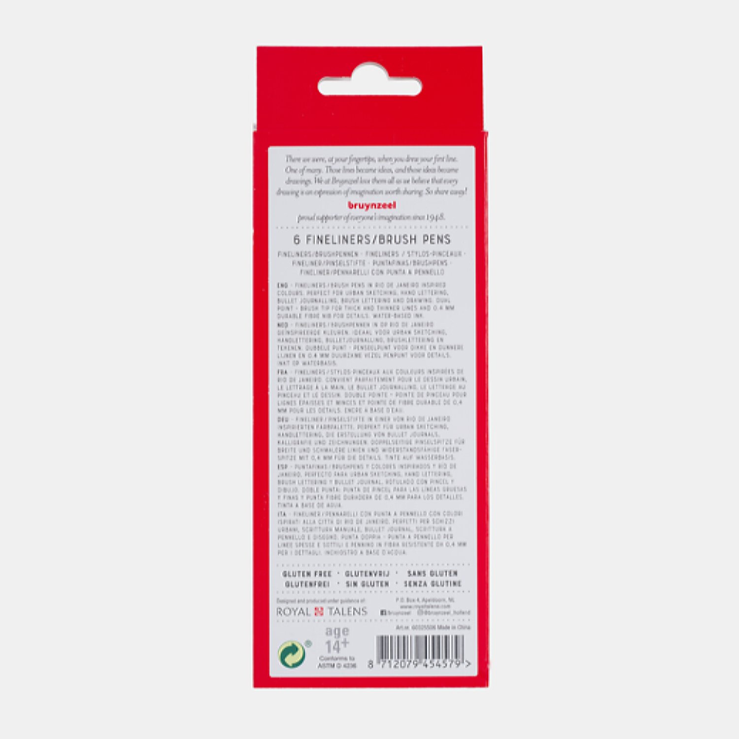 Набор капиллярных ручек BRUYNZEEL Creatives Рио-де-Жанейро толщина линии 0.4мм кисть 6 цветов в картонной упаковке 60325506