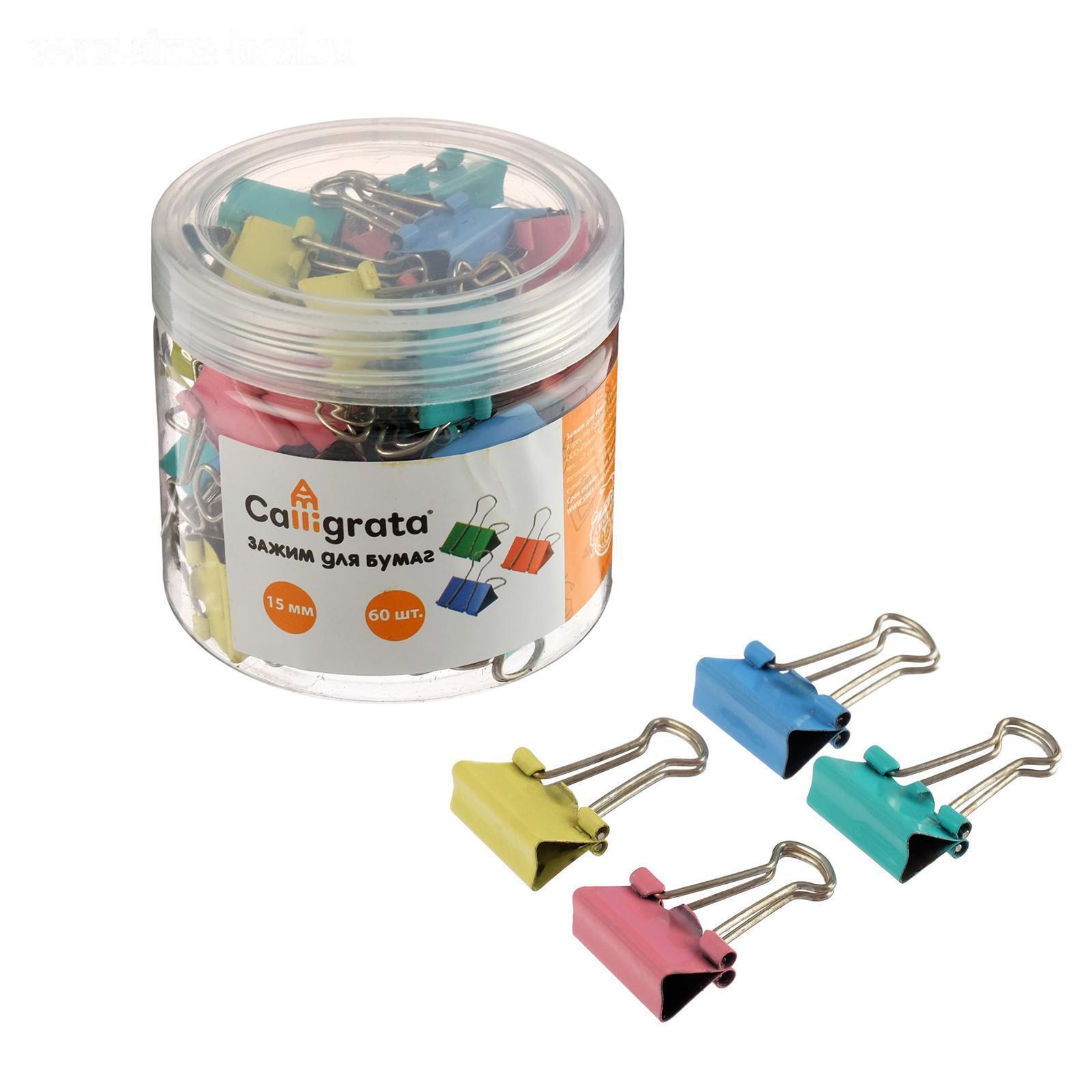Набор зажимов для бумаг Calligrata, 4 цвета, 15 мм, 60 шт., в пластиковой тубе, МИКС