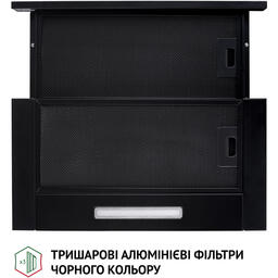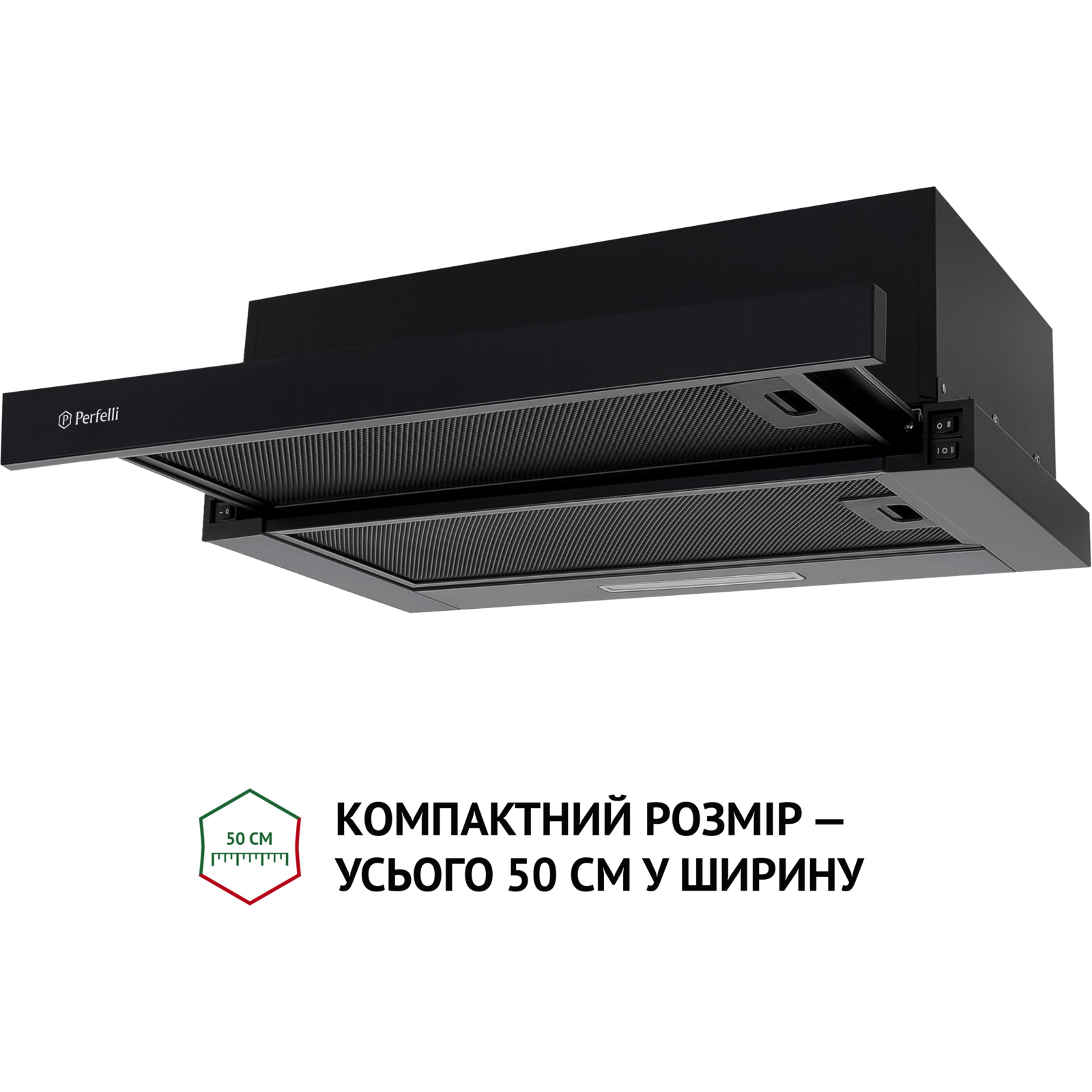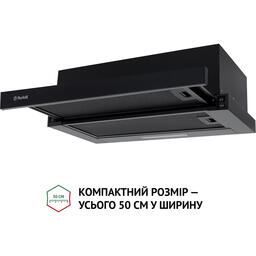Телескопічна витяжка Perfelli TL 5316 BL 700 LED спроектована таким чином, що більша частина її конструкції ховається у навісну кухонну шафу. Очевидною залишається тільки висувна панель, яка задіюється під час роботи і виглядає дуже стильно. Цей тип витяжки ідеально впишеться у сучасний інтер'єр. Ширина приладу складає 50 см — це універсальний розмір, який підходить для розміщення над варильною поверхнею приблизно такого ж розміру.