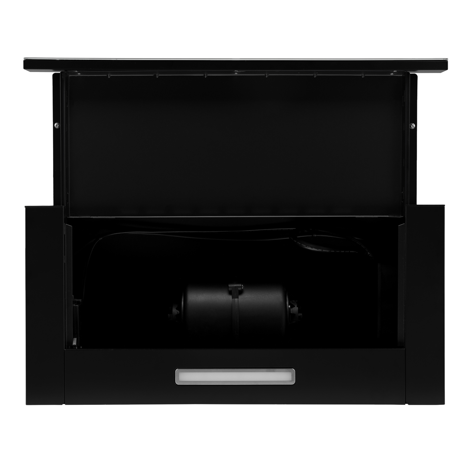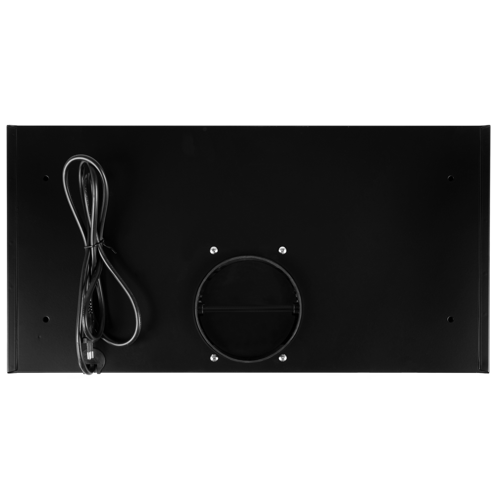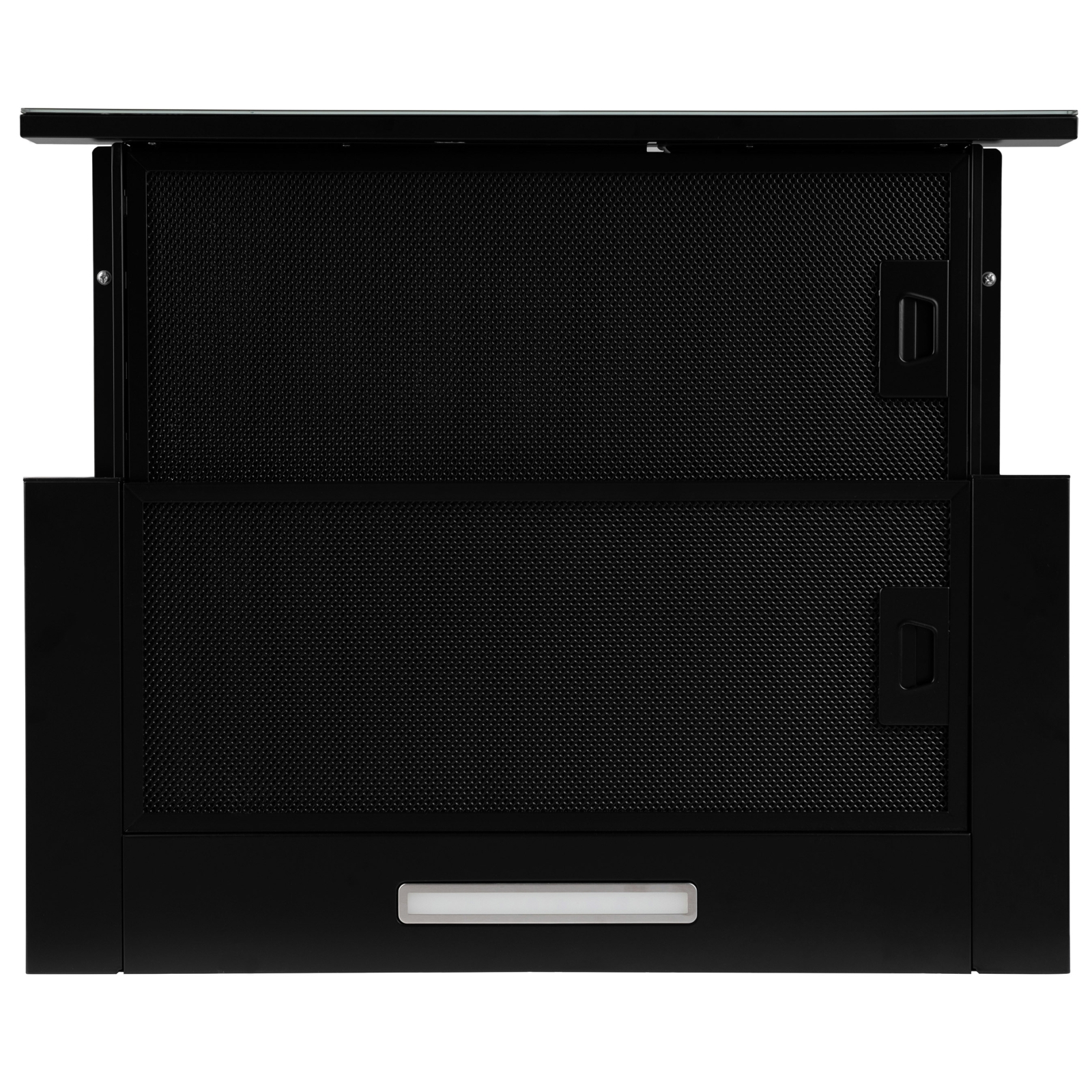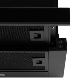 Корпус витяжки виготовлений із фарбованого металу, а висувна панель декорована загартованим склом. Цьому матеріалу властива висока стійкість до перепадів температур та механічних впливів. Також загартоване скло набагато безпечніше, ніж звичайне.