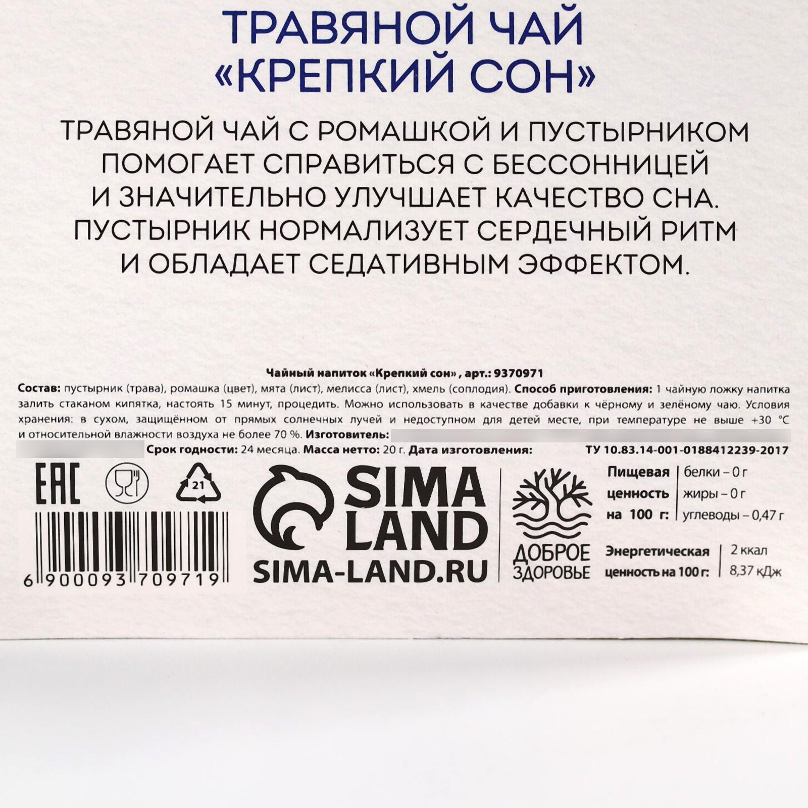 Состав: пустырник (трава), ромашка (цвет), мята (лист), мелисса (лист), хмель (соплодия).