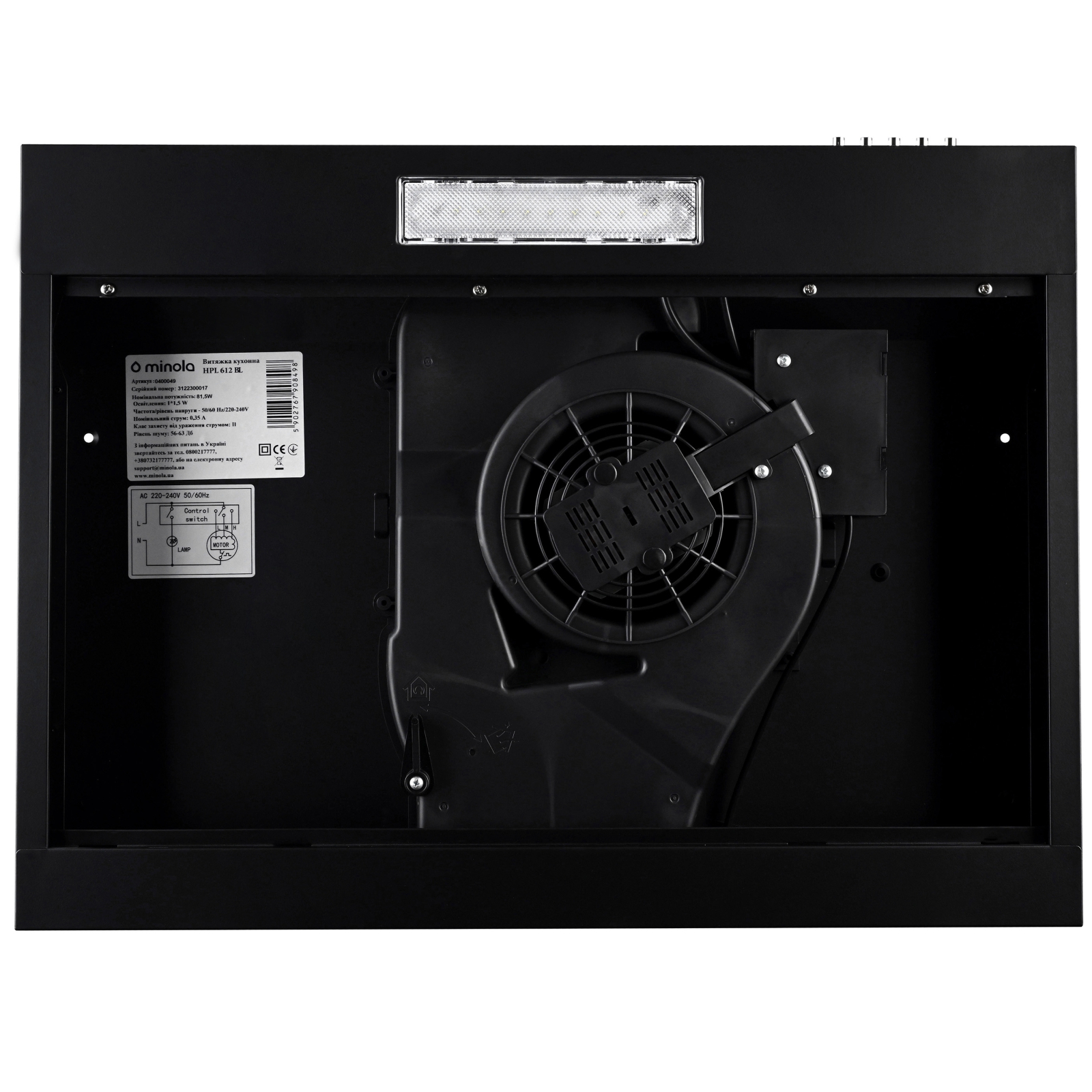 Плоска кухонна витяжка Minola HPL 612 обладнана одним двигуном потужністю 80 Вт. Максимальна продуктивність пристрою в режимі відведення повітря становить 450 м³/год, що дозволяє ефективно видаляти випари, небажані запахи та кіптяву, які утворюються в процесі приготування їжі.