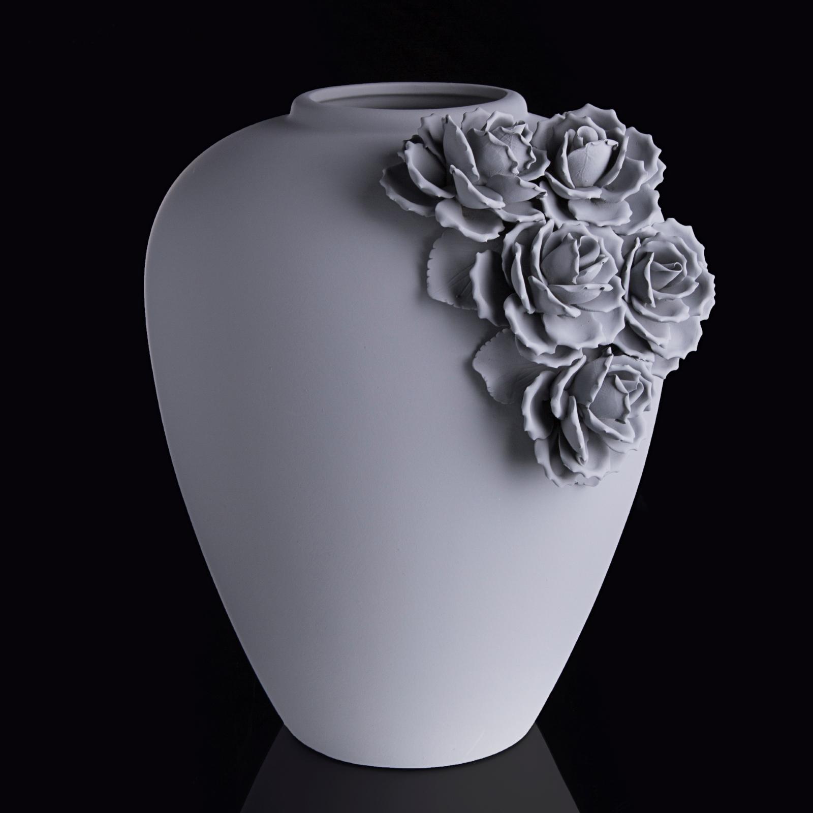 Взгляните: эта ваза удивительной красоты уже с цветами! Пышные розы, которыми она декорирована, не увянут и не потеряют своего очарования, при этом они сделаны так тонко и искусно, что даже не верится, что материал, из которого они изготовлены, - керамика. Изящная ваза ручной работы сама по себе – жемчужина интерьера. Если же поставить в нее яркий букет, от этой композиции трудно будет отвести взгляд. Окружайте себя элегантными предметами – именно они день ото дня поднимают настроение и привносят в интерьер дома атмосферу изысканного шика.