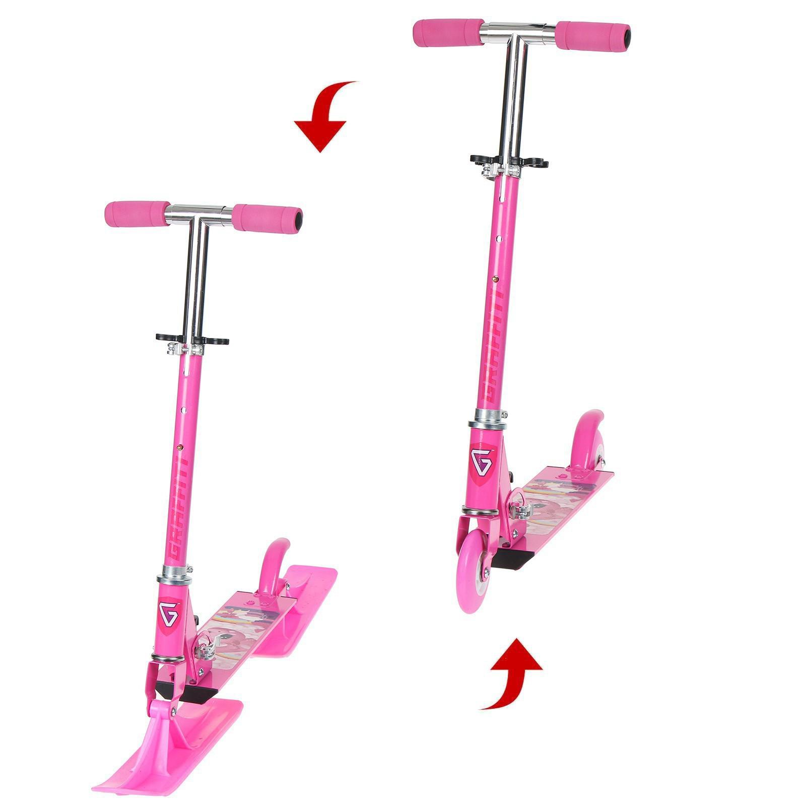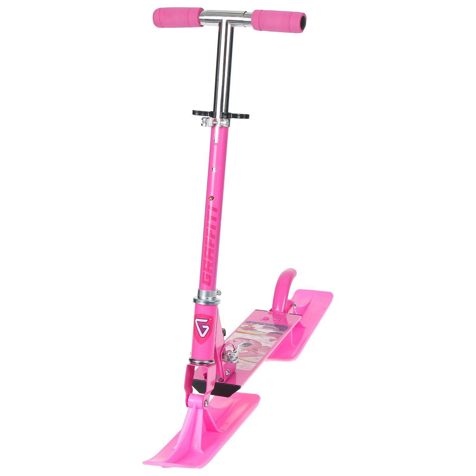 Детский самокат-снегокат — новая модель для летнего и зимнего активного отдыха. Конструкция представляет собой раму самоката, на которую установлены лыжи. Передняя лыжа управляется поворотом руля. Колёса можно установить в любой момент, для этого в комплекте есть всё необходимое.