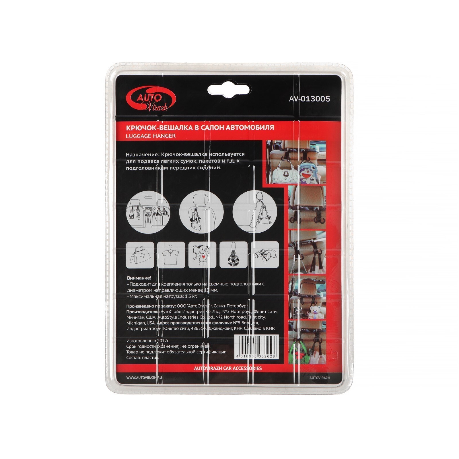 Вешалка - крючок Autovirazh универсальный на подголовник, в блистере, черный, 2 шт