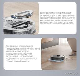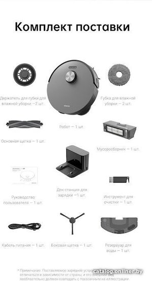 • Комплектация Основная щетка — 1 шт.Мусоросборник — 1 шт.Кабель питания — 1 шт.Резервуар для воды — 1 шт.Робот — 1 шт.Держатель для губки для влажной уборки — 2 шт.Док-станция для зарядки —1 шт.Инструмент для очистки — 1 шт.Губка для влажной уборки — 2 шт.Боковая щетка — 1 шт.Руководство пользователя — 1 шт.