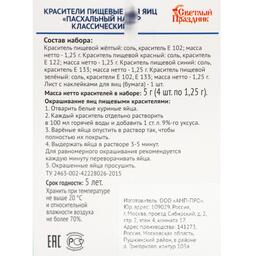 Краситель пищевой жёлтый: соль, краситель Е102; масса нетто - 1,25 г. Краситель пищевой красный: соль, краситель Е122; масса нетто - 1,25 г. Краситель пищевой синий: соль, краситель Е 133; масса нетто - 1,25 г. Краситель пищевой зелёный: соль, красители Е102, Е133; масса нетто - 1,25 г. Лист с наклейками для яиц (бумага) - 1 шт.