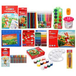 Содержит все необходимые материалы для занятий рисованием, лепкой и декоративно-прикладным творчеством.