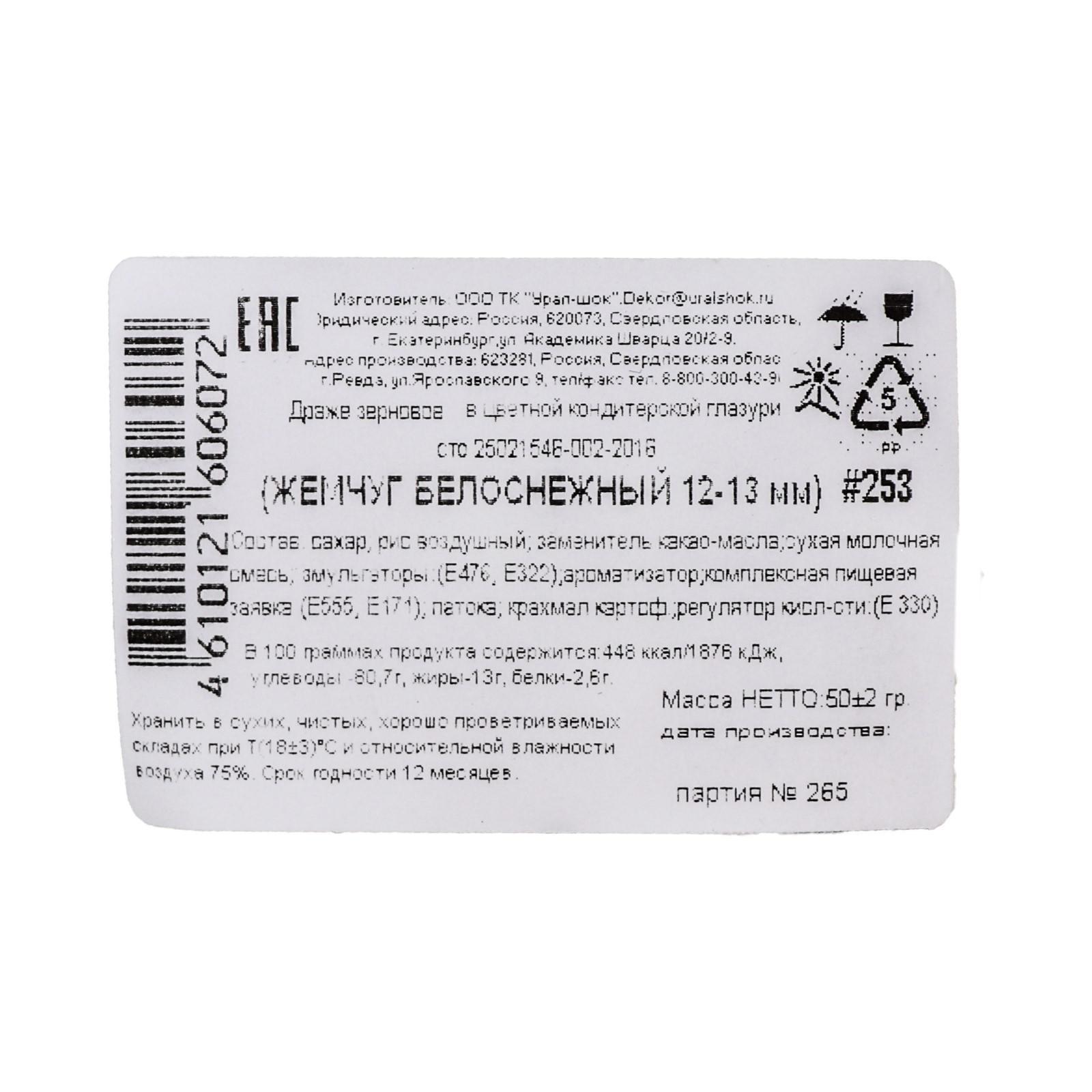 Посыпка кондитерская "Жемчуг" в цветной кондитерской глазури белоснежный 12-13 мм, 50г