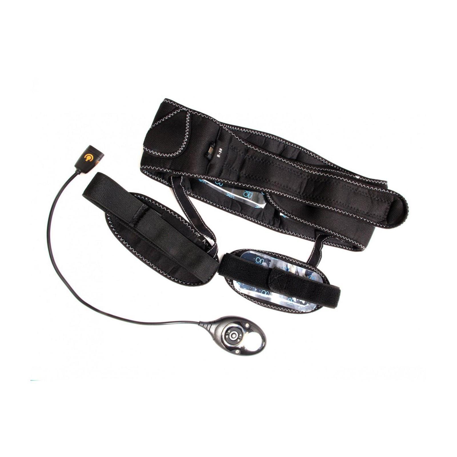 Расположите пояс таким образом, чтобы ярлычок находился в середине поясницы. Оберните пояс вокруг таза и застегните его. Снимите покрытие с чёрных сторон электронных накладок на частях пояса, закрепляющихся на бедрах. Застегните части пояса вокруг них таким образом, чтобы электронные накладки прилегали к задней поверхности под ягодицами. Проверьте расположение электронных накладок.