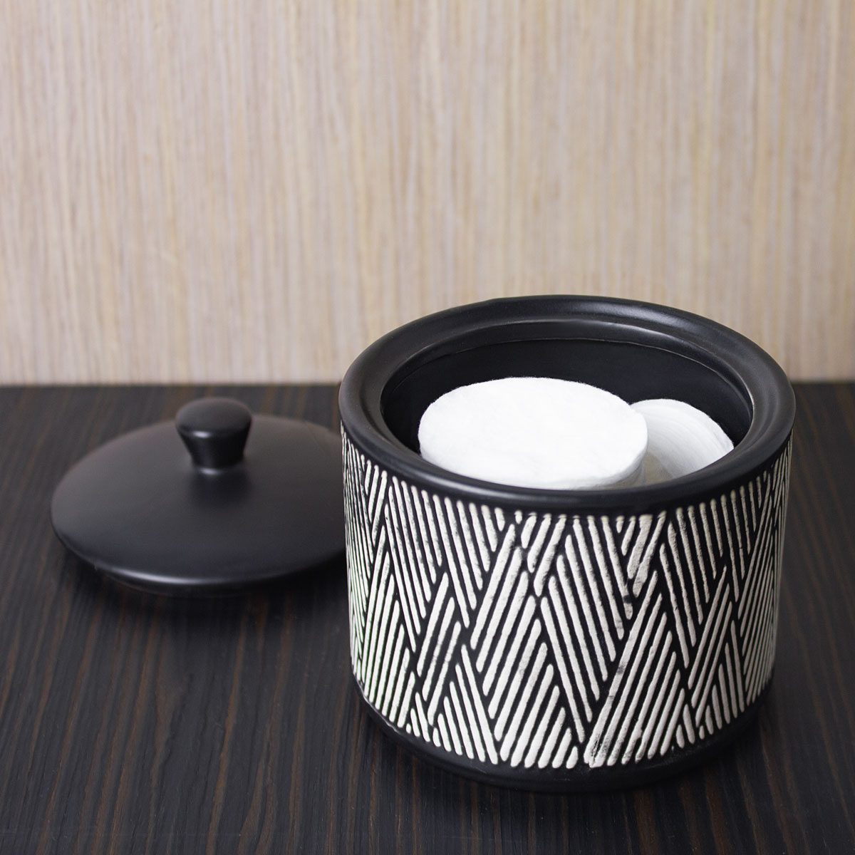 Баночка для ватных дисков - это не просто удобная вещь, а самое настоящее украшение ванной комнаты. Контейнер для ватных дисков выполнен из керамики и снабжен удобной крышечкой. Такое оформление аксессуара смотрится стильно и необычно. Теперь можно пользоваться ватными дисками с комфортом, а также получать от этого эстетическое удовольствие. Вы сможете придать своей ванной комнате неповторимый вид. Стильный дизайн. Крышка в комплекте обеспечивает гигиеничность.