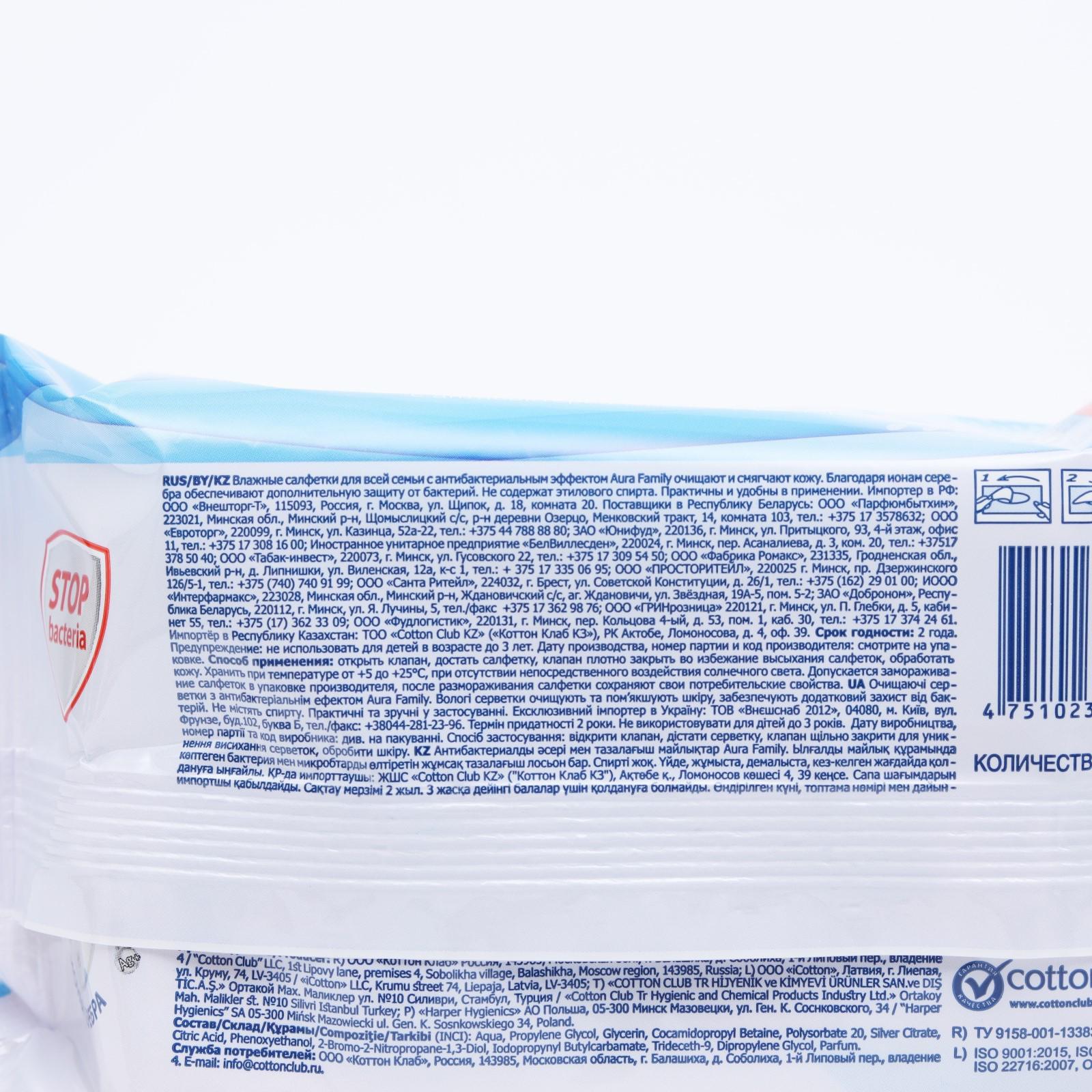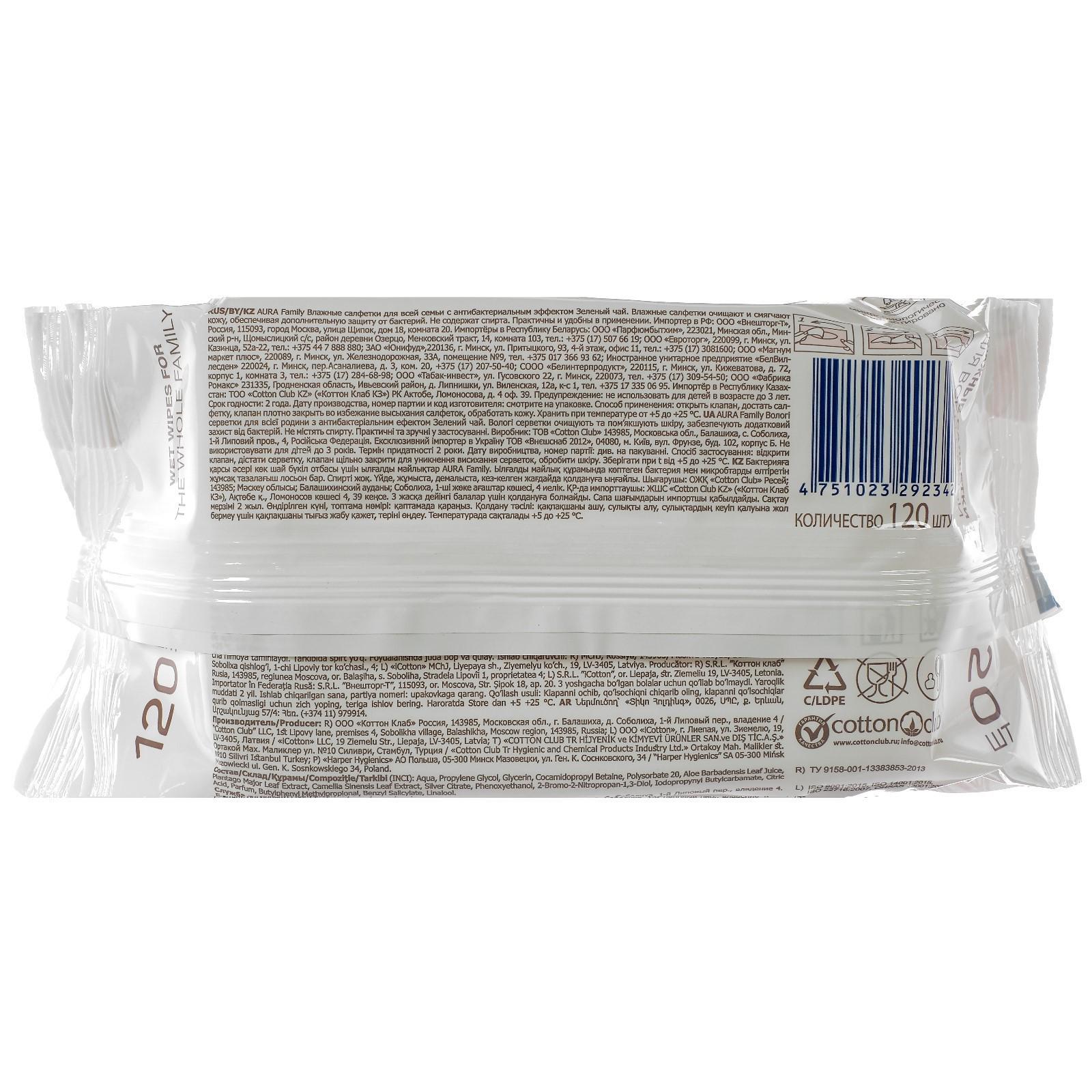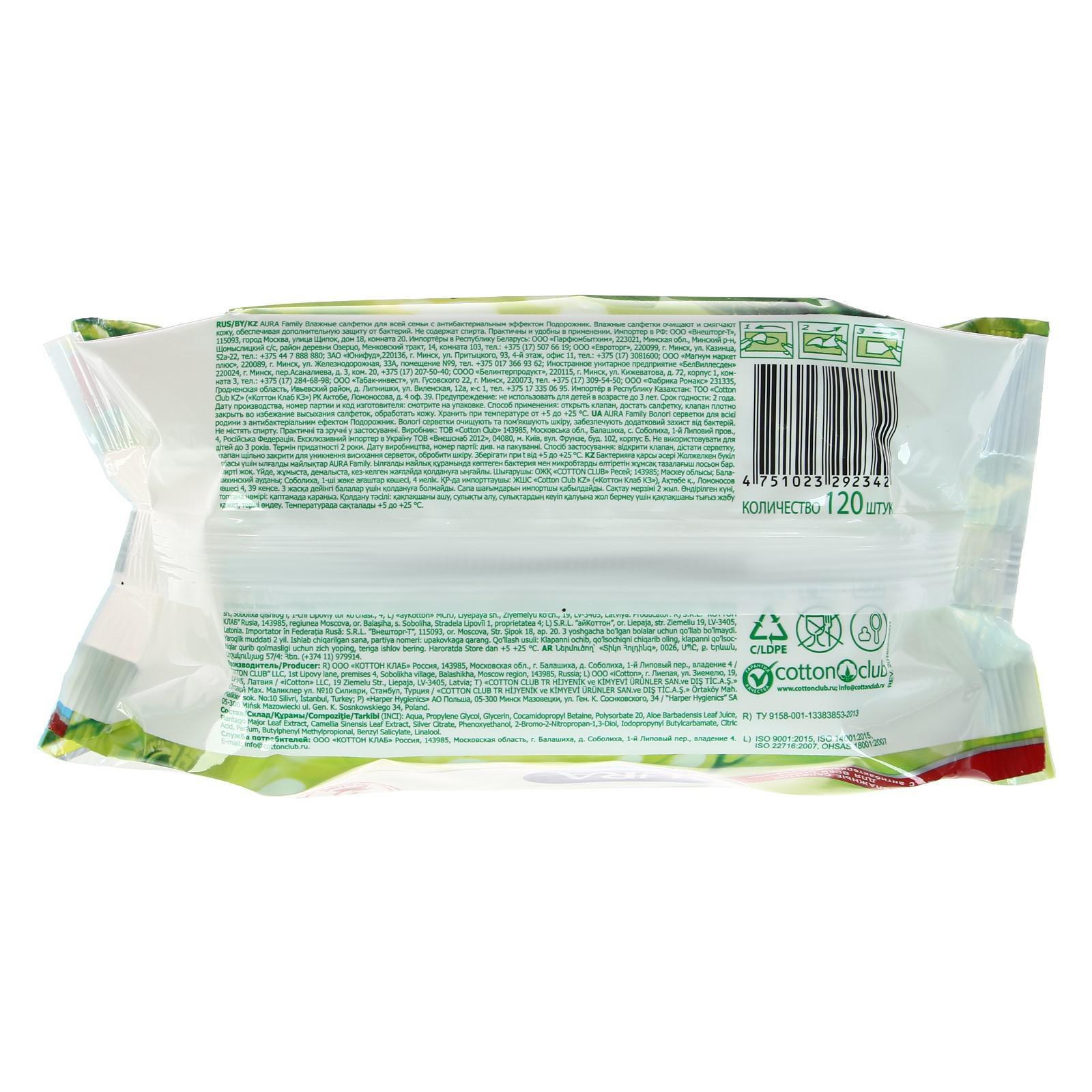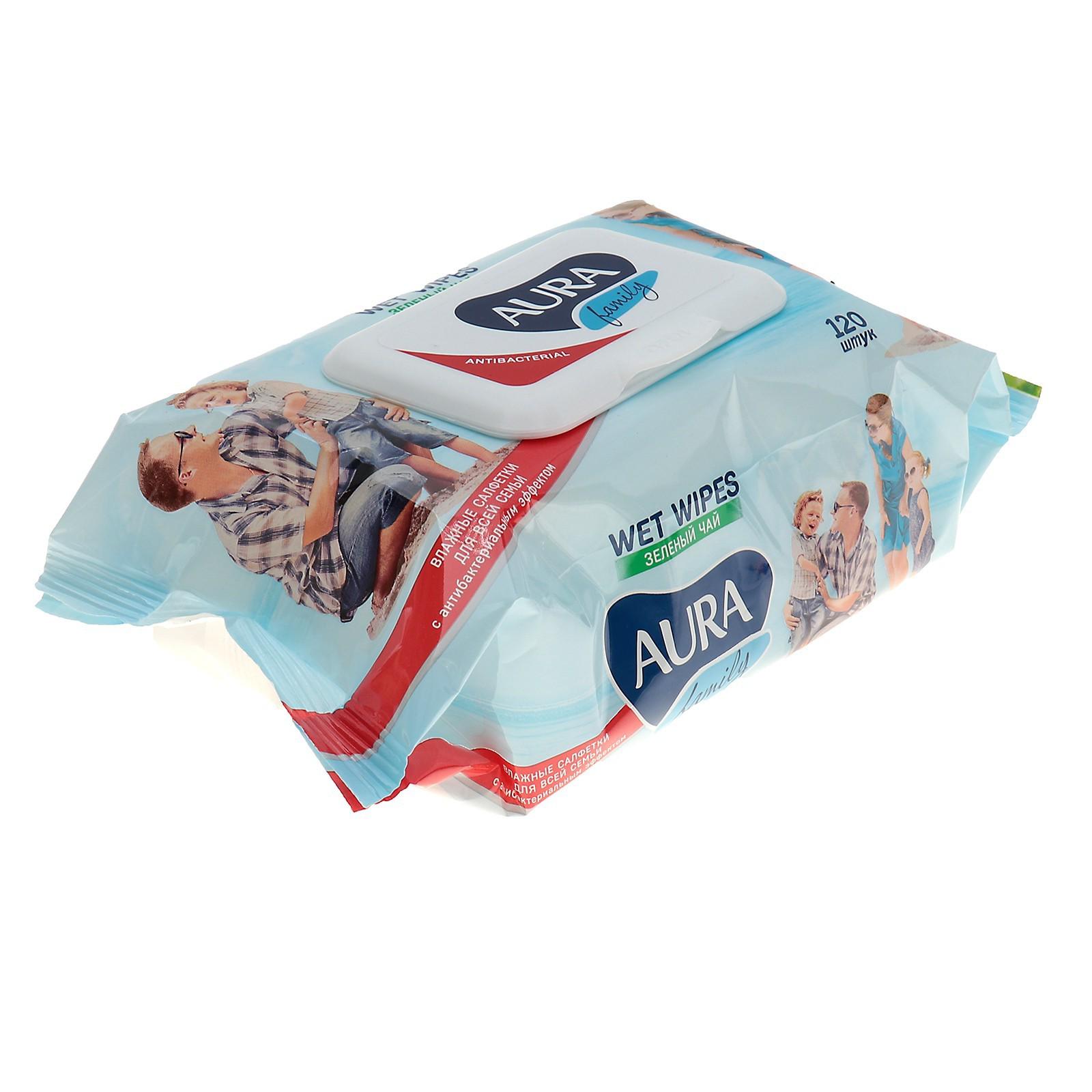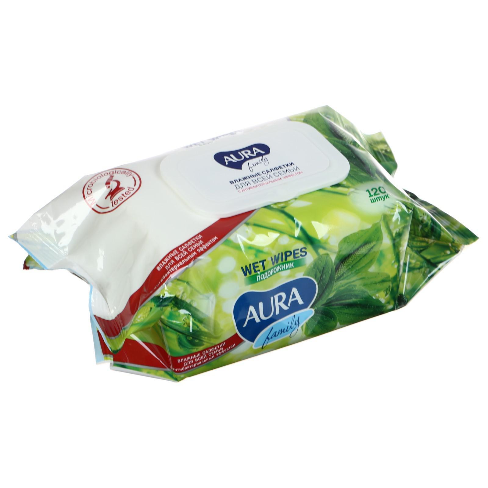 Влажные салфетки AURA FAMILY, для всей семьи, с антибактериальным эффектом 120 шт