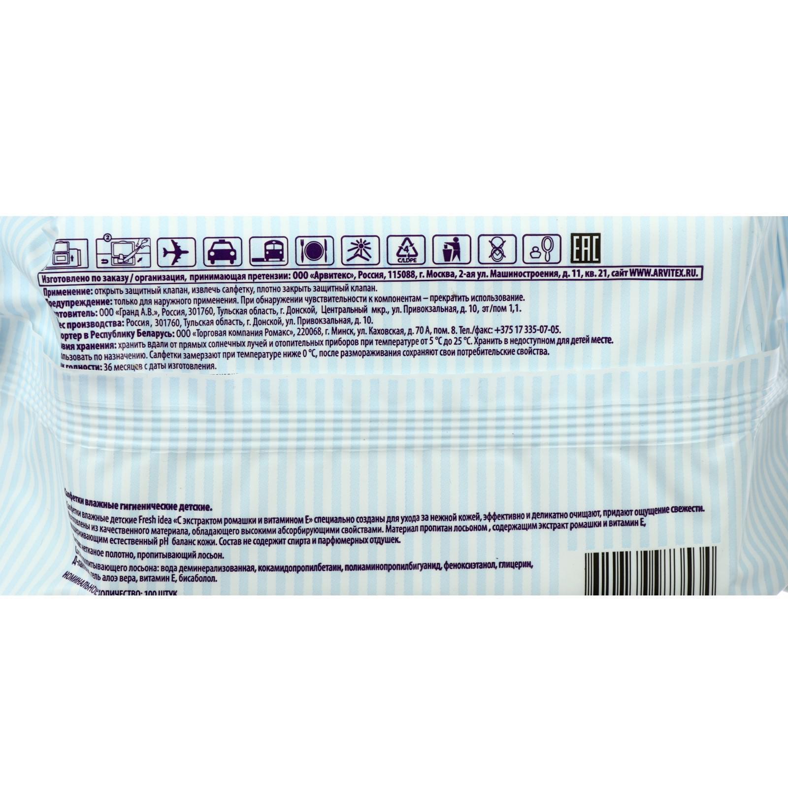 Описание: салфетки влажные детские Fresh idea "специально созданы для ухода за нежной кожей детей, эффективно и деликатно очищают, придают ощущение свежести. Изготовлены из качественного нетканного материала, обладающего высокими абсорбирующими свойствами. Материал пропитан лосьоном, содержащим экстракт ромашки и витамин Е, поддерживающим естественный ph-баланс кожи. Состав не содержит спирта. Удобная и экономичная упаковка с крышкой.