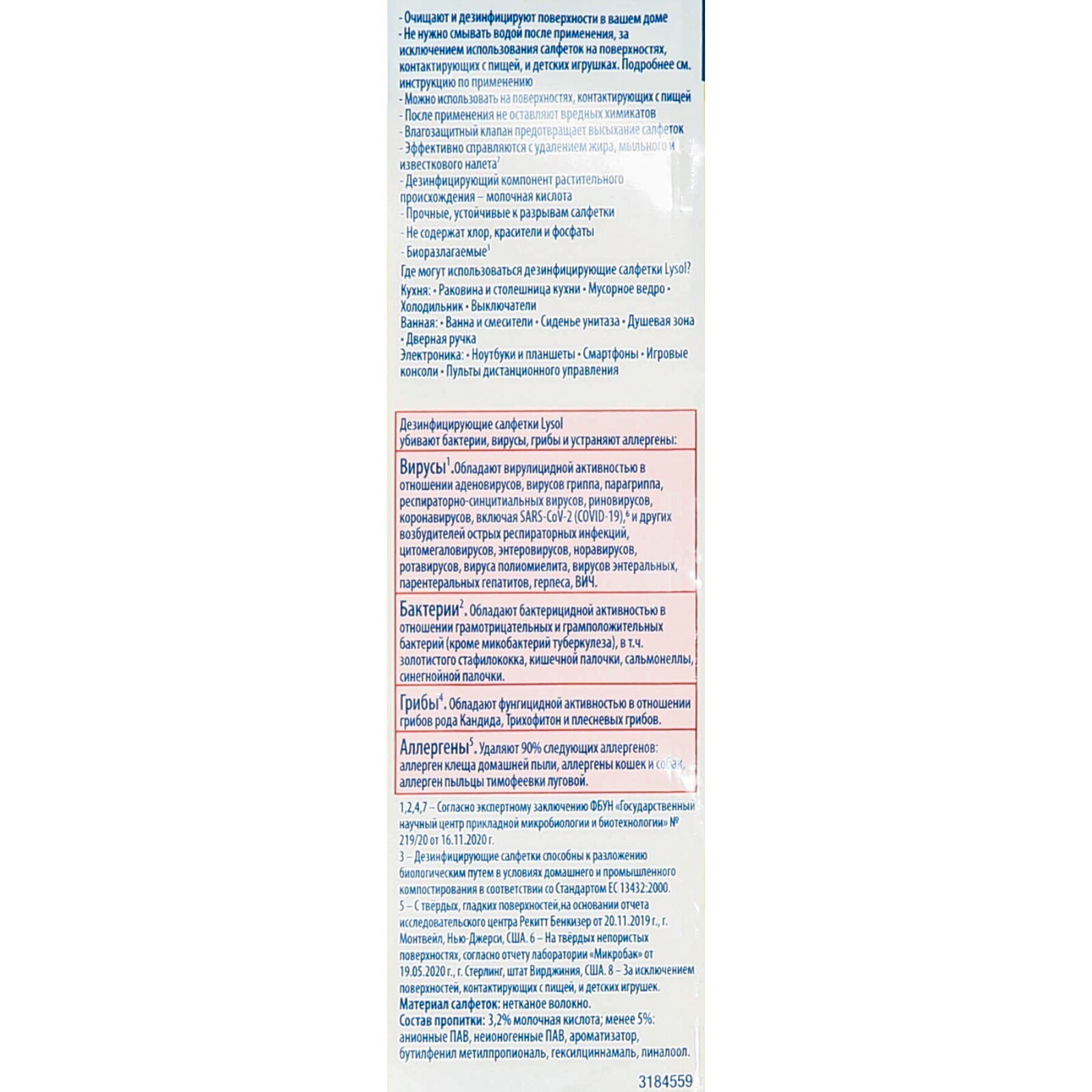 Описание: средство дезинфицирующее для поверхностей ""Дезинфицирующие салфетки Lysol"" Свежесть океана, 80 шт.. Для здоровья и безопасности вас и ваших близких важно следить за чистотой в доме и проводить регулярную уборку. Однако при обычной уборке на поверхностях могут оставаться вирусы и бактерии, которые невидимы глазу. Именно поэтому нужно не только протирать, но и дезинфицировать поверхности и предметы.