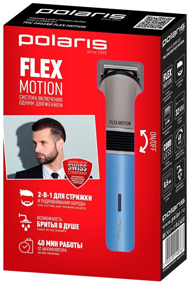 Машинка для стрижки бороды Polaris PHC-0401RB имеет технологию гнущегося корпуса. Модель работает от аккумулятора в течении 40 минут без подзарядки.