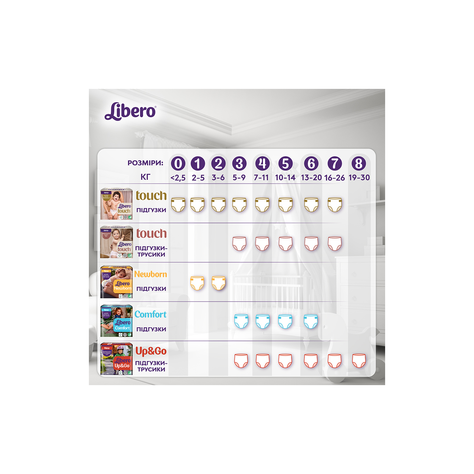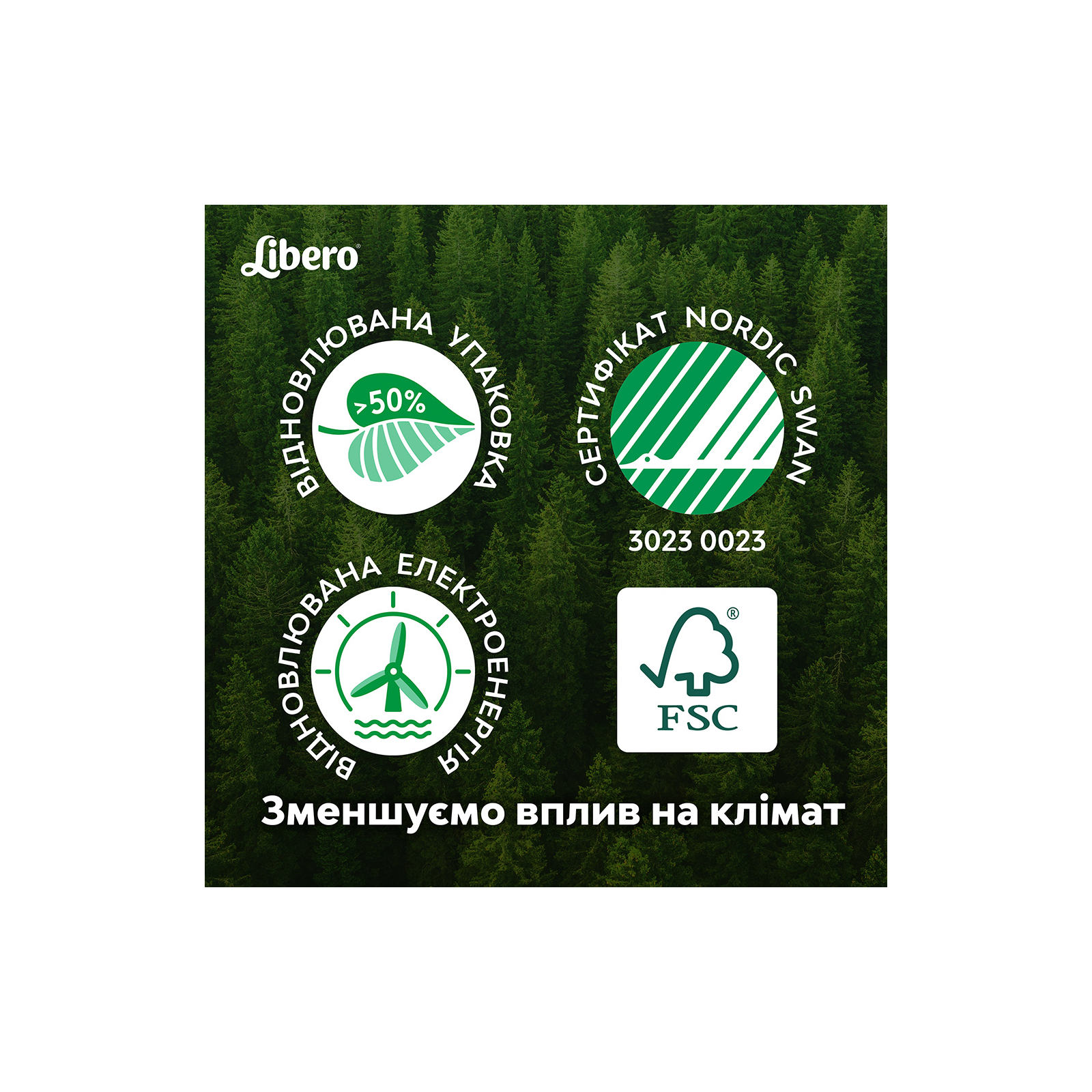 Libero Touch — це наші найм'якші і cуперпреміальні підгузки, зручні, ніби зшиті кравцем. Підгузки Libero м'які і тонкі, не містять лосьйонів. Вони розроблені таким чином, щоб дозволяти шкірі дихати і при цьому чудово вбирають. Підгузки Libero створені з турботою про малюка і про навколишнє середовище. При виробництві підгузків ми використовуємо тільки якісні матеріали, відповідаючи принципам дбайливого ставлення до природи (сертифікат FSC, Nordic Ecolabel). Вся продукція Libero тестується дерматологічно і підходить малюкам з чутливою шкірою (сертифікат Asthma Allergy Nodric). Доведено зниження кліматичного впливу на 16-25% за весь життєвий цикл продукції Libero, а саме скорочення викидів вуглекислого газу (CO2). За рахунок реалізації концепції > 50% відновлюваної упаковки і відновлюваної електроенергії Libero досягне додаткового зниження на 4.6%.