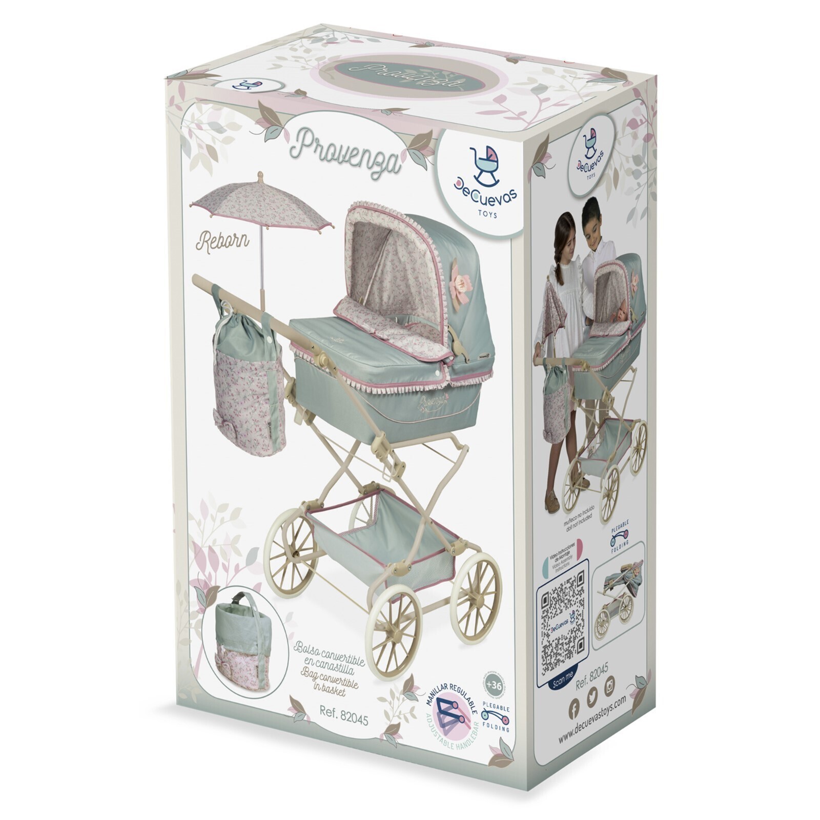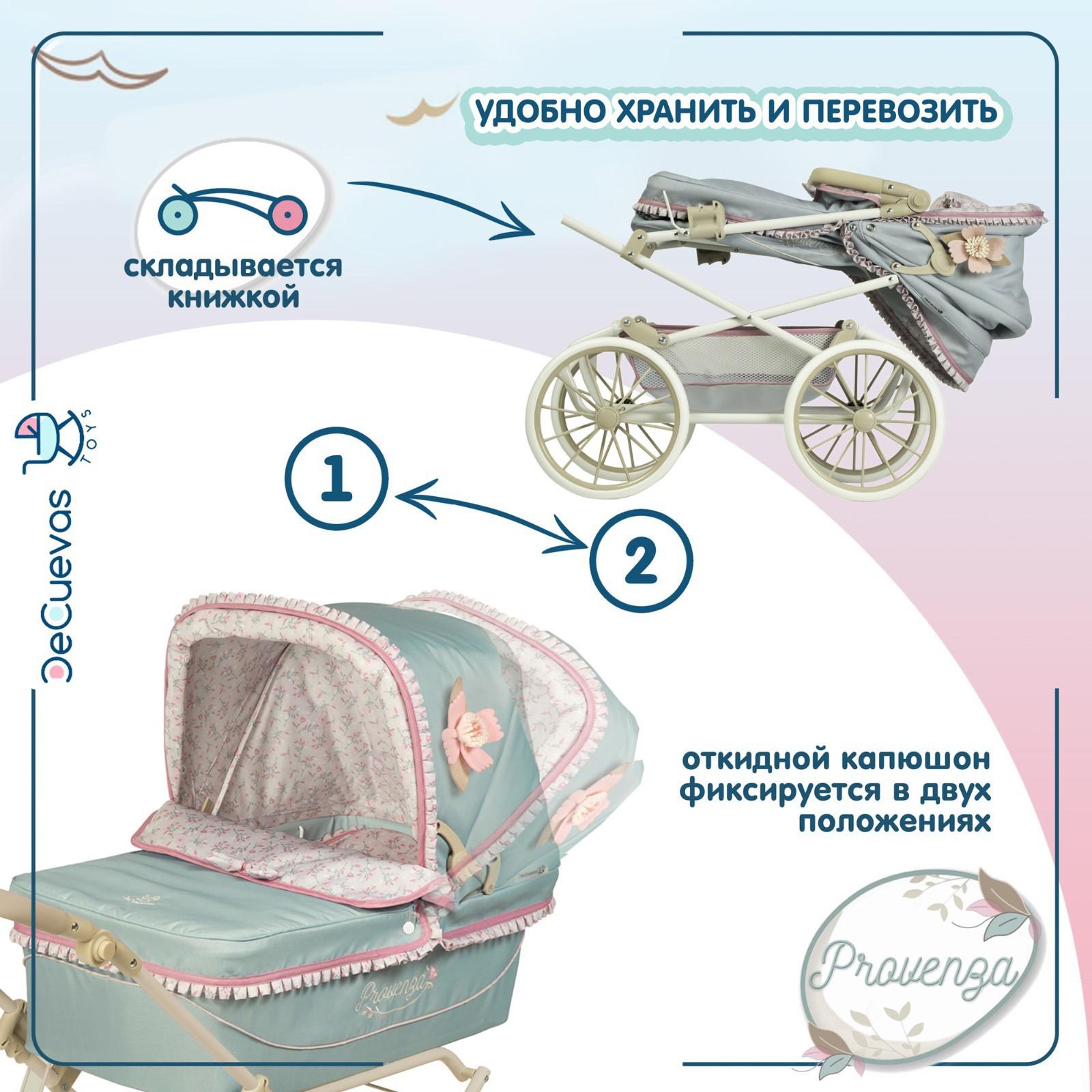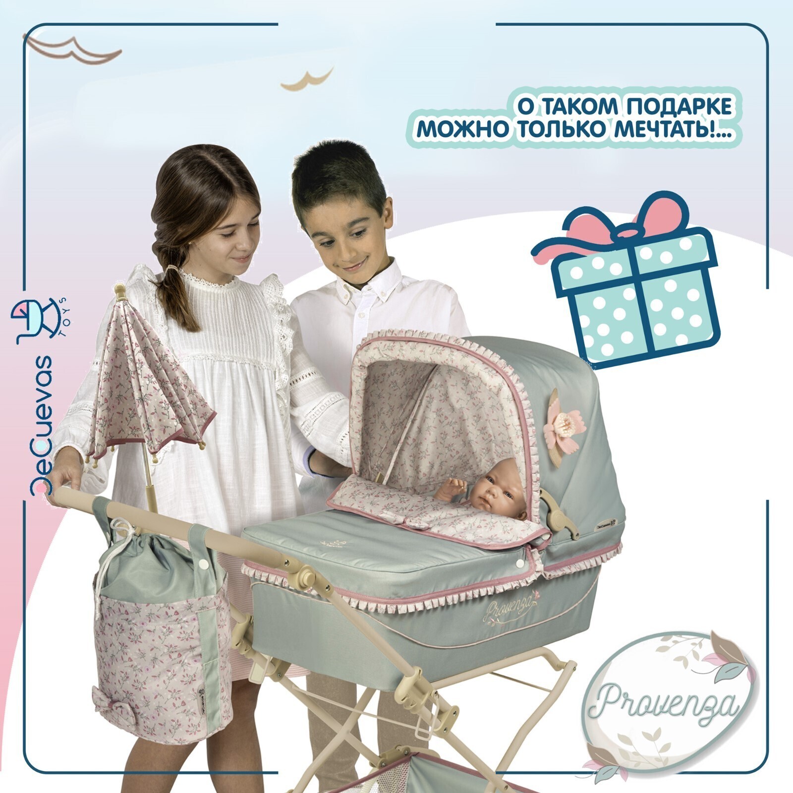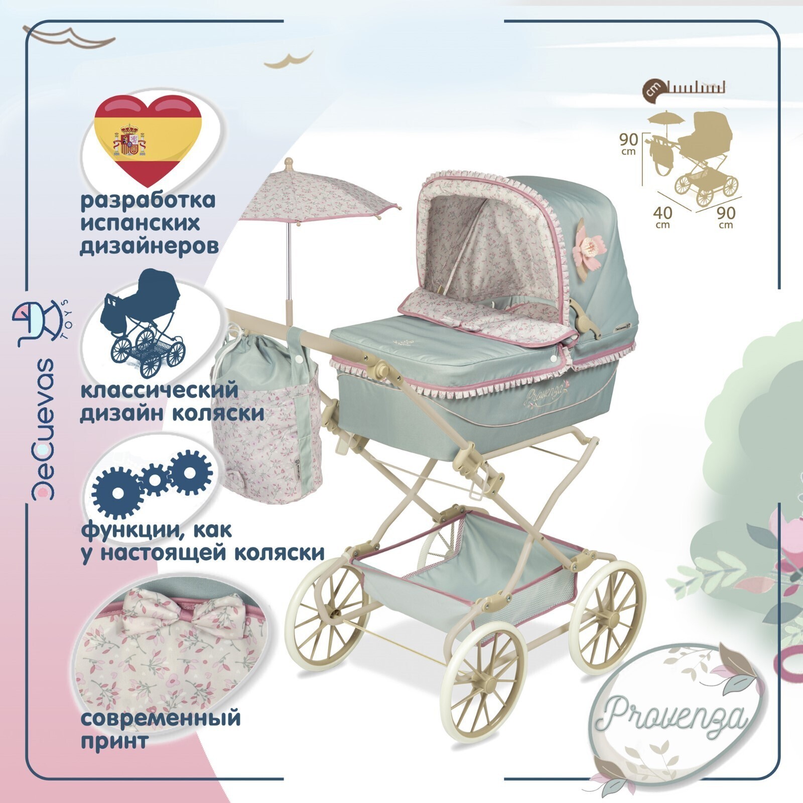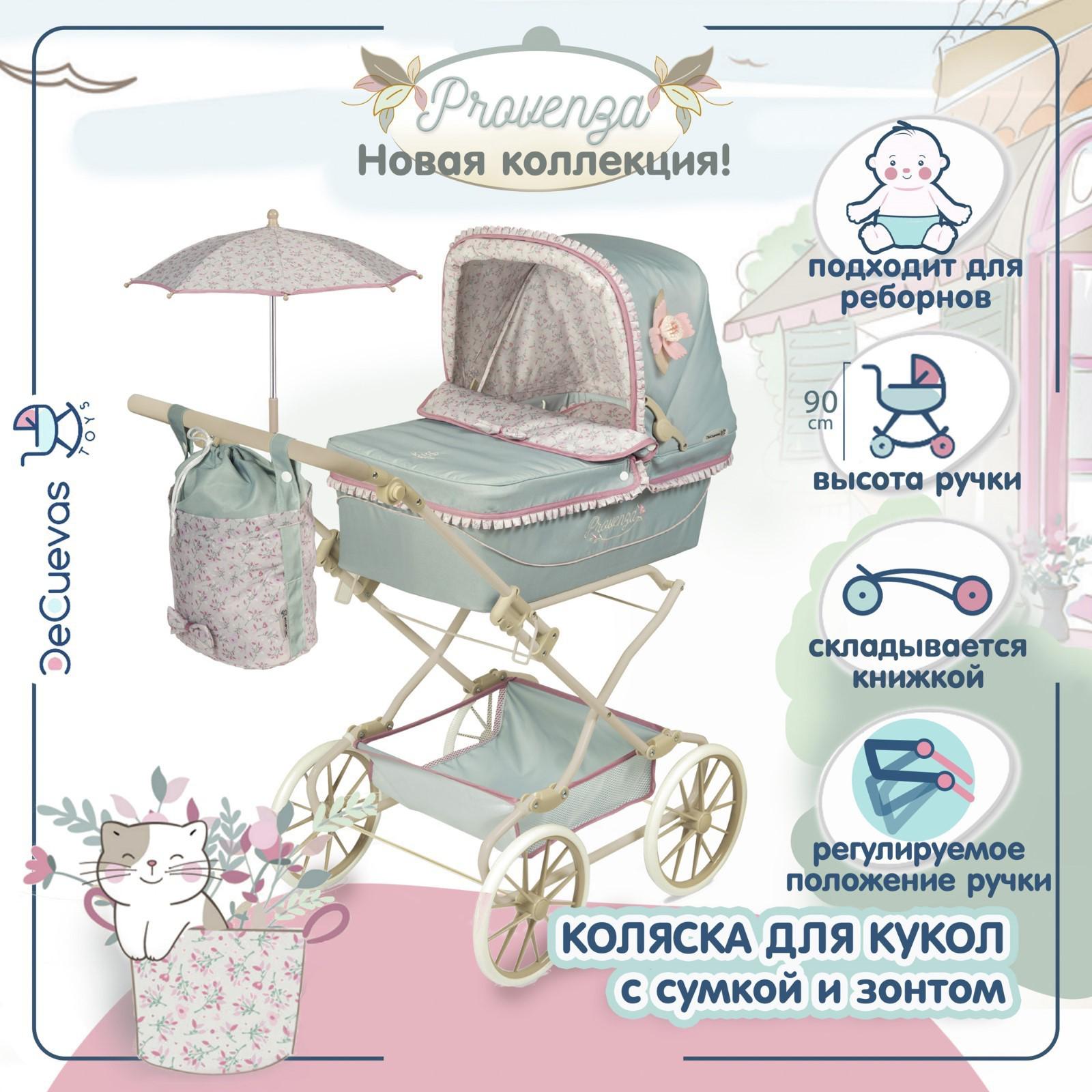 Коляска для кукол люлька испанского бренда DeCuevas Toys, со съёмной сумкой-кисетом и зонтом. Высота ручки от пола 90 см, подойдет для девочек от 7 до 14 лет.