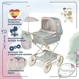 Серия колясок для кукол Прованс воплотила краски оливковых рощ и розовых закатов над виноградниками региона Прованс. Мягкие пастельные оттенки зеленого и цветочный принт напоминают о разнообразии цветов и растений юга Франции. Стиль Прованс проявляется и во внимании к деталям: цветочные орнаменты, рюши и кружева в декоре игрушечных колясок.