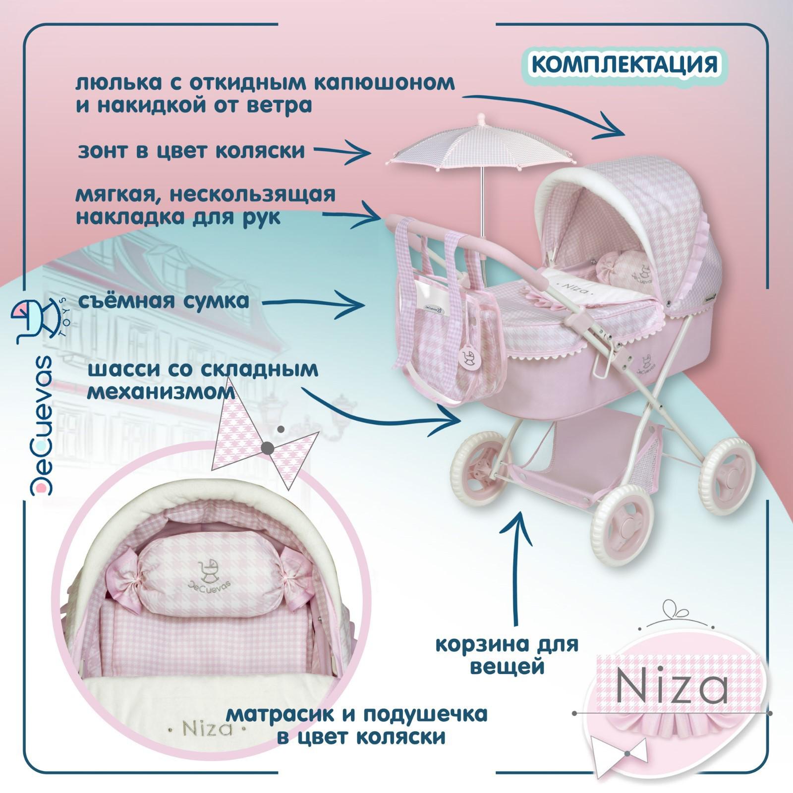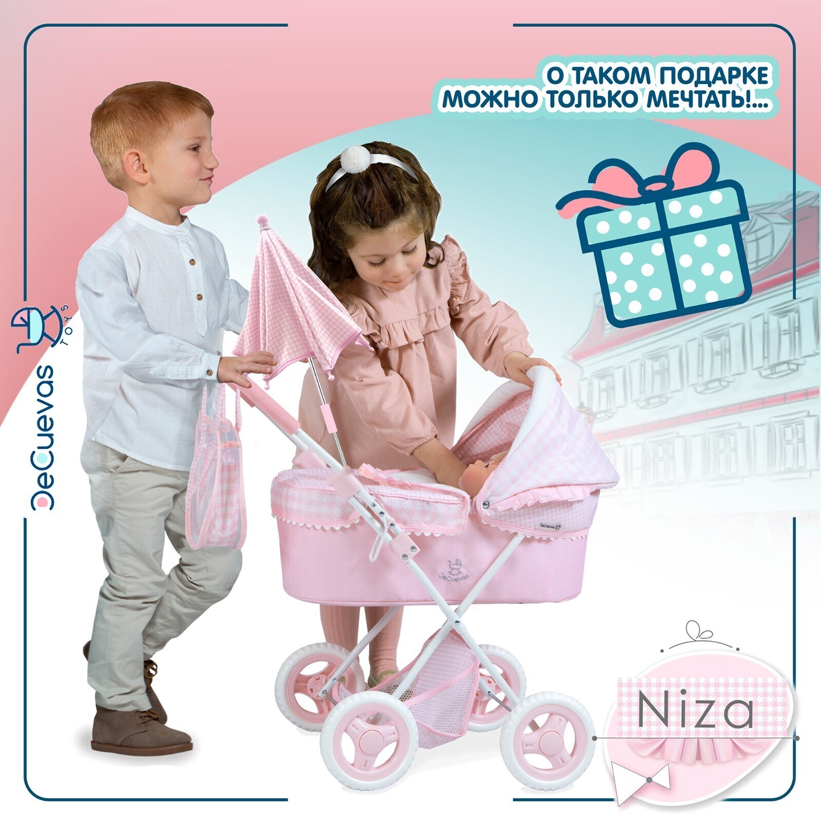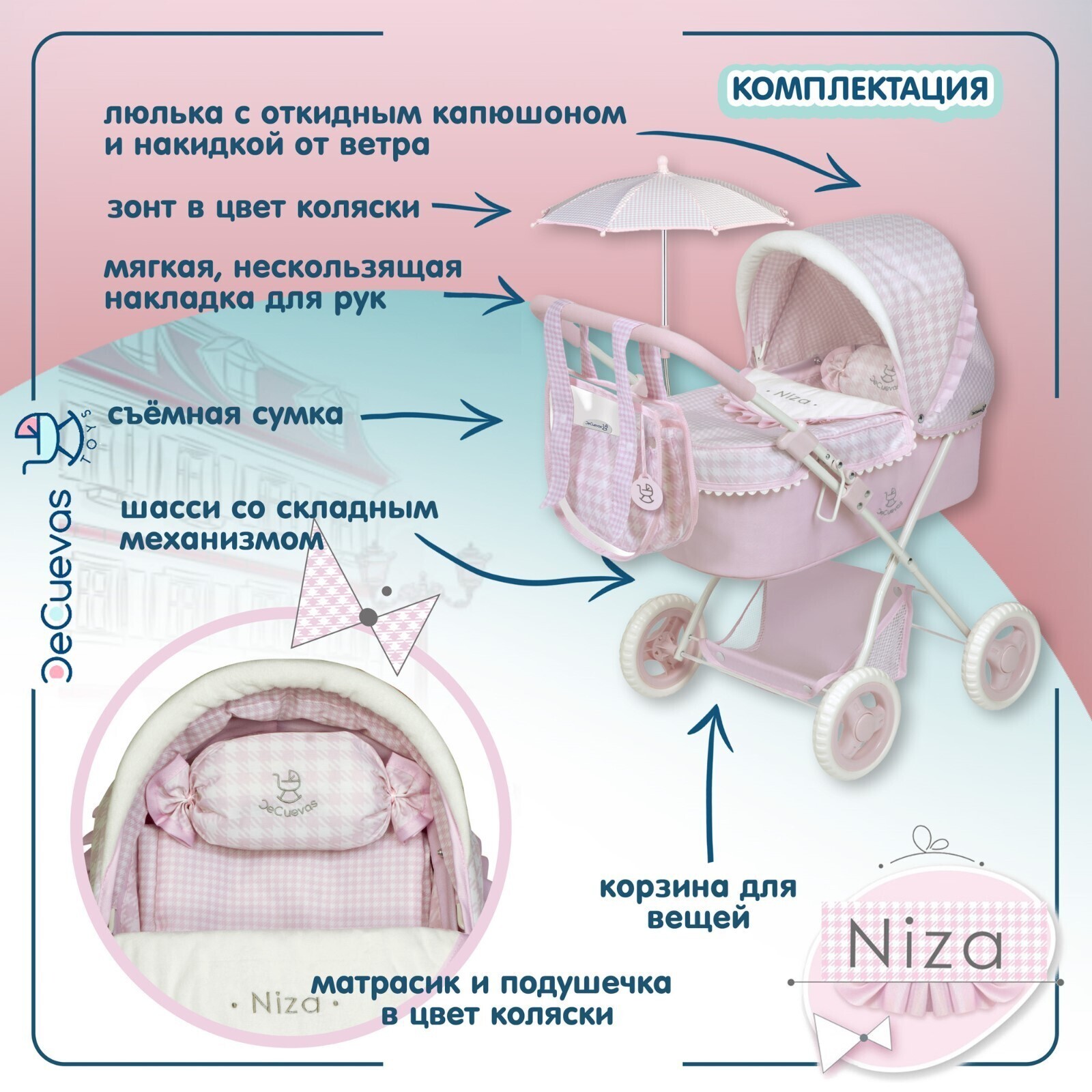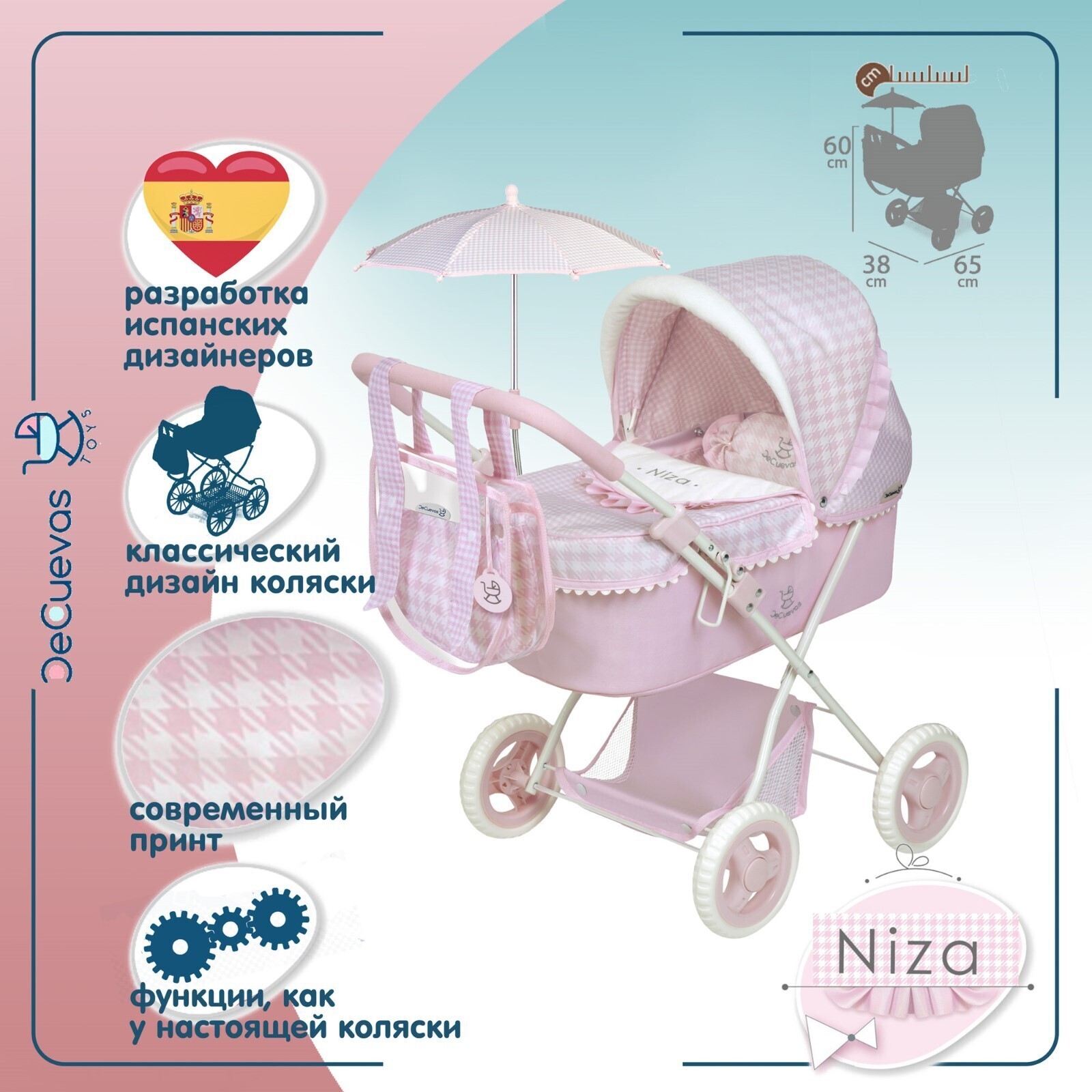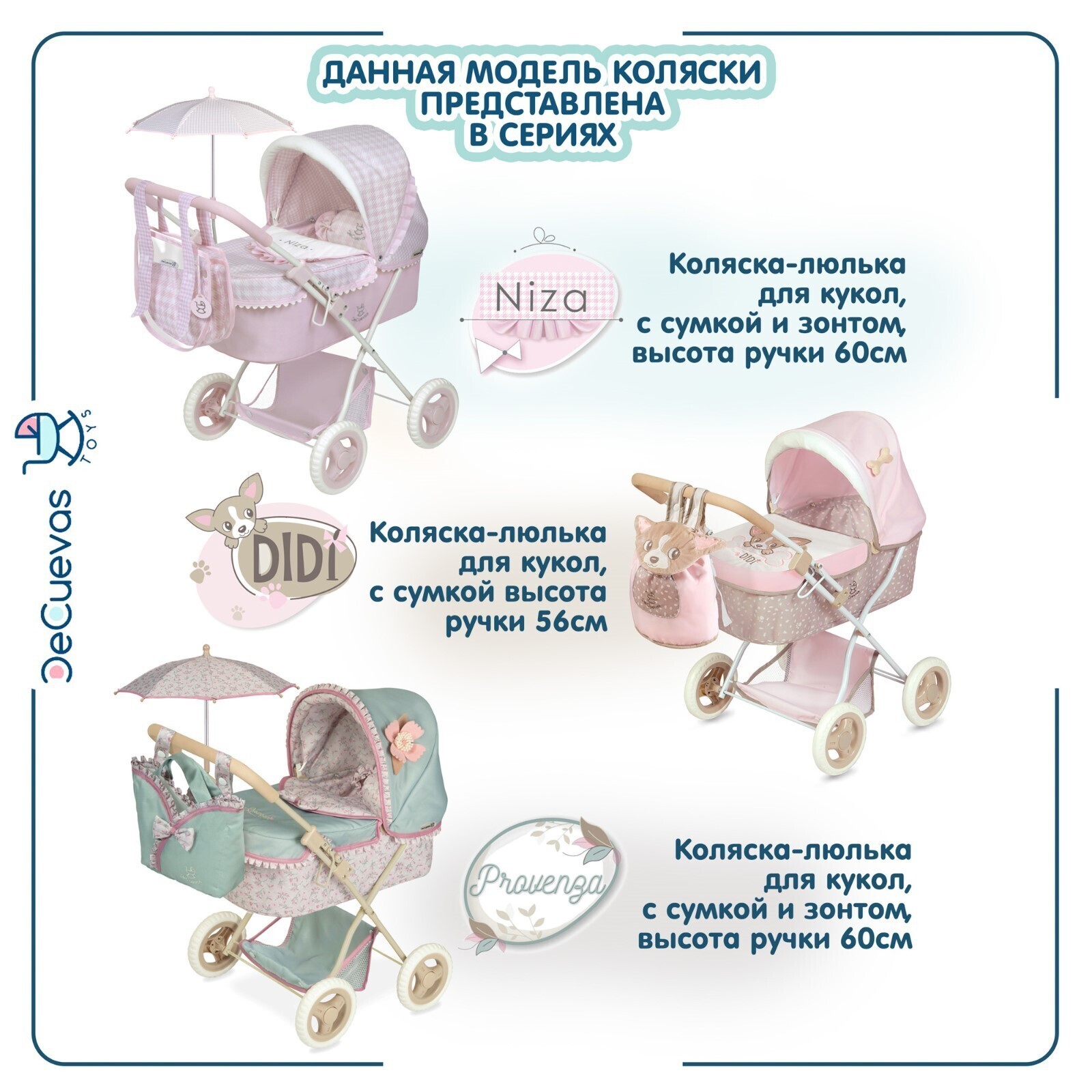 Коляска для кукол люлька испанского бренда DeCuevas Toys, со съёмной прозрачной сумкой и зонтом. Высота ручки от пола 60 см, подойдет для девочек от 3 до 7 лет.