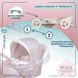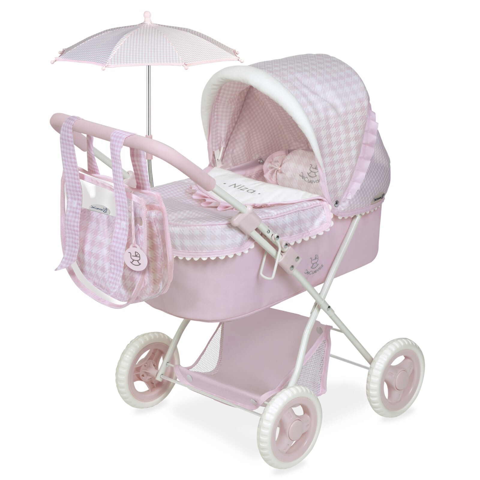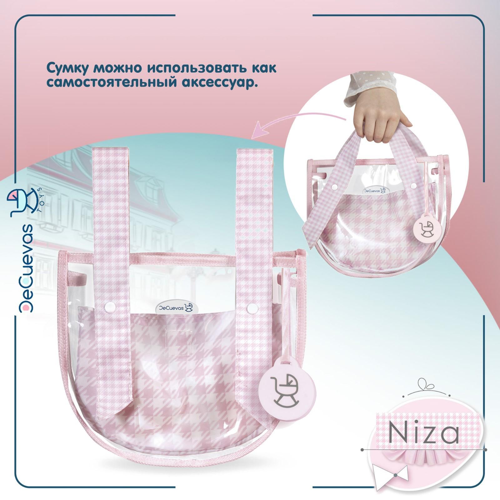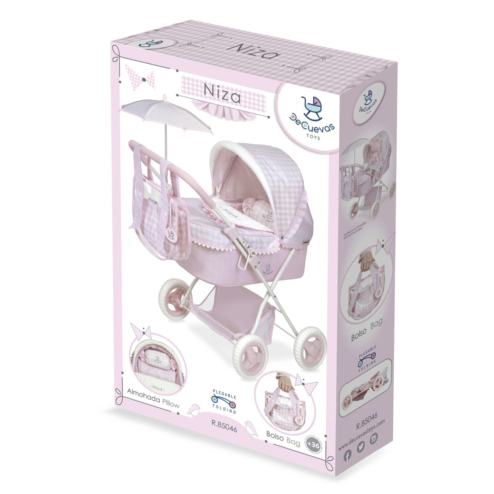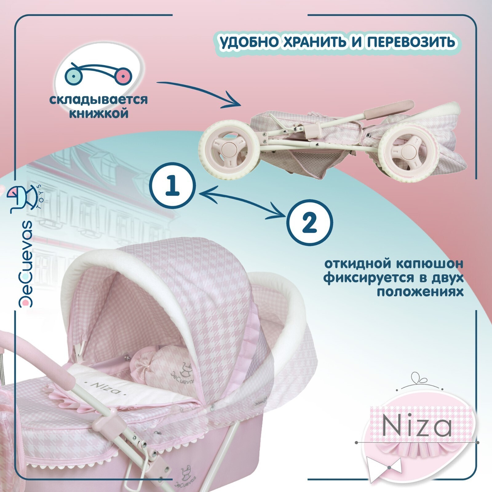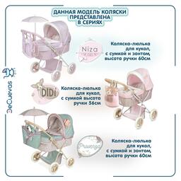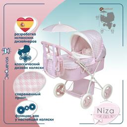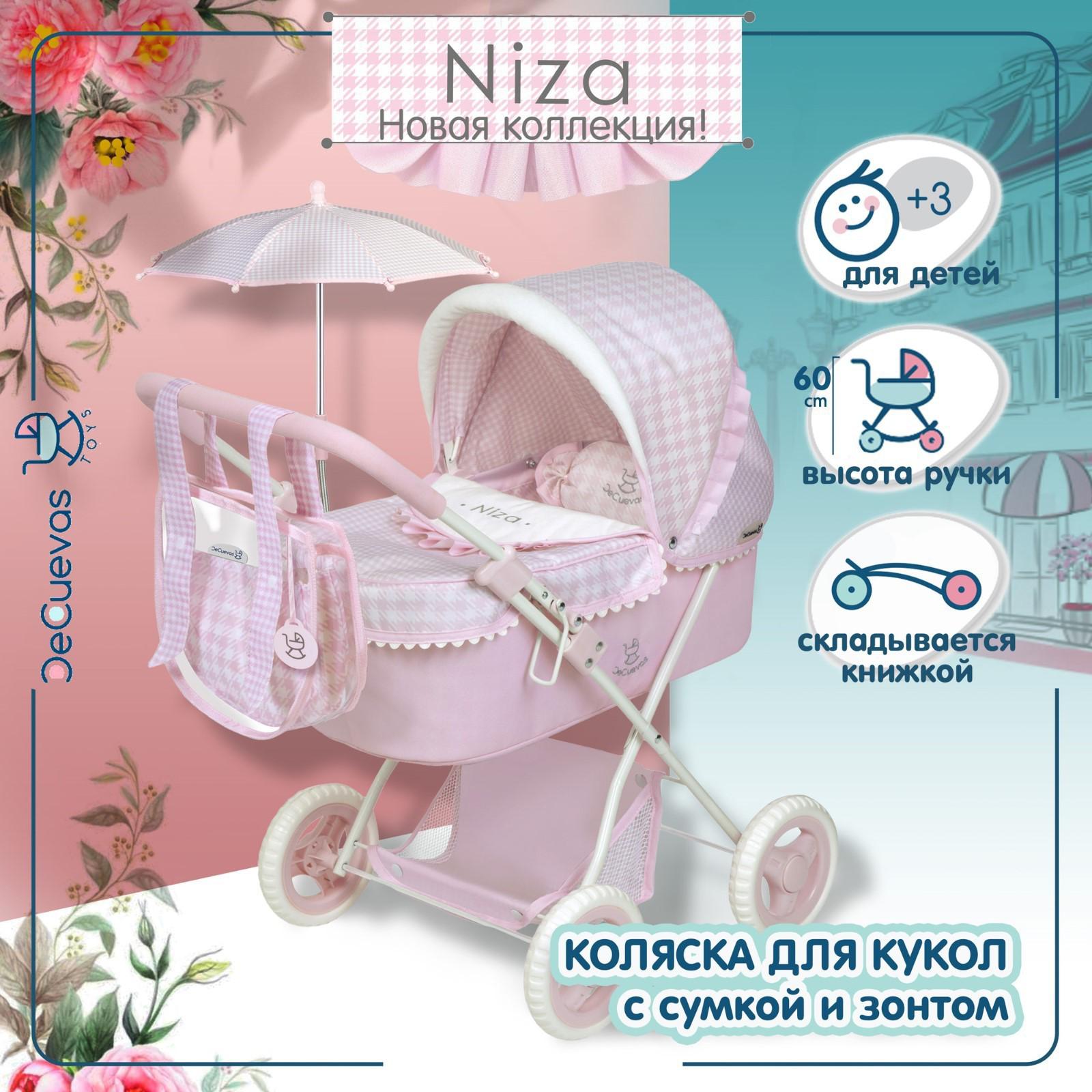 Коляска для кукол люлька испанского бренда DeCuevas Toys, со съёмной прозрачной сумкой и зонтом. Высота ручки от пола 60 см, подойдет для девочек от 3 до 7 лет.