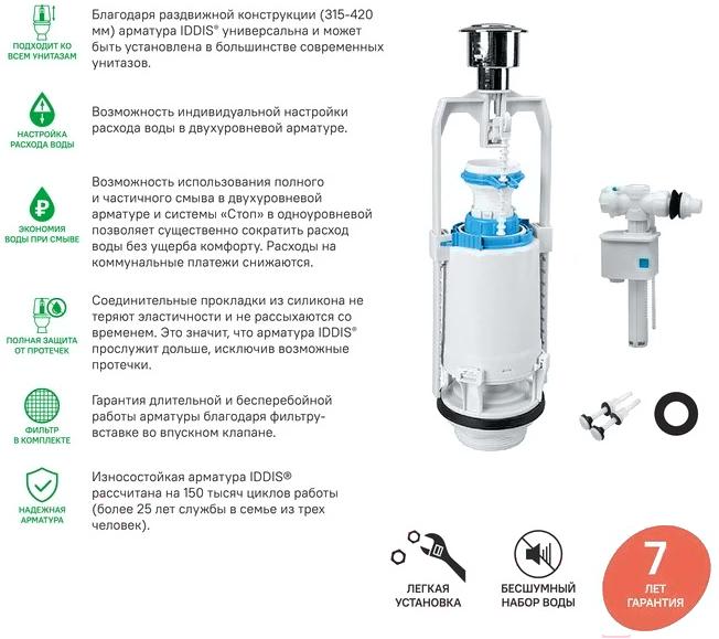 - Комплектация арматура спускная, арматура наполнительная, прокладка, крепеж, паспорт