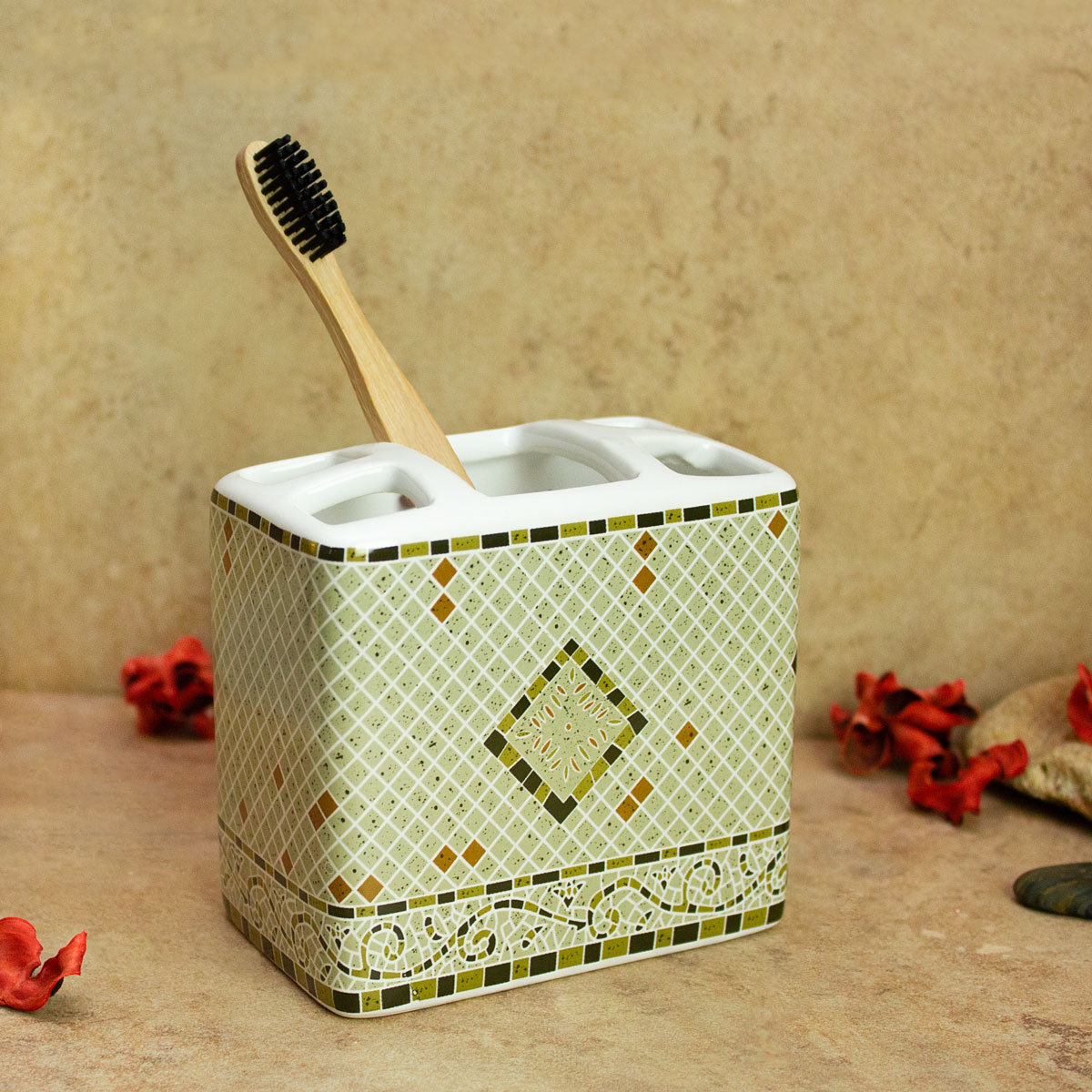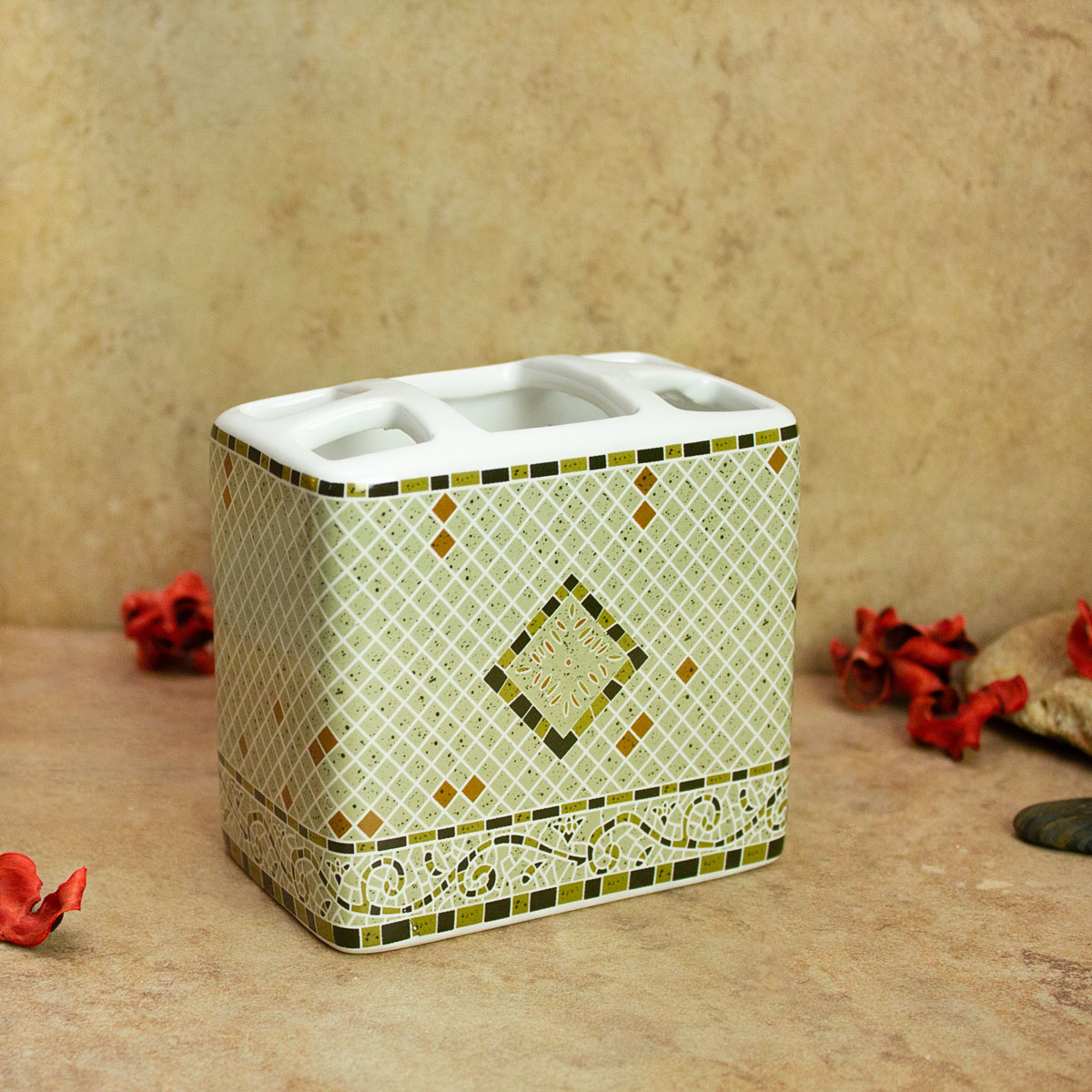 Керамический стакан для зубных щеток будет гармонично смотреться на столешнице или раковине в ванной современного или классического стиля.Данный аксессуар выполнен из керамики. Керамическая поверхность легко очищается и моется. В стакане для ванной комнаты можно хранить зубные щетки с пастой или же другие необходимые вещи – кисти для макияжа, расчески или бритвенные станки. Подобрав другие аксессуары в едином стиле из нашей коллекции, вы сможете придать своей ванной комнате неповторимый вид.