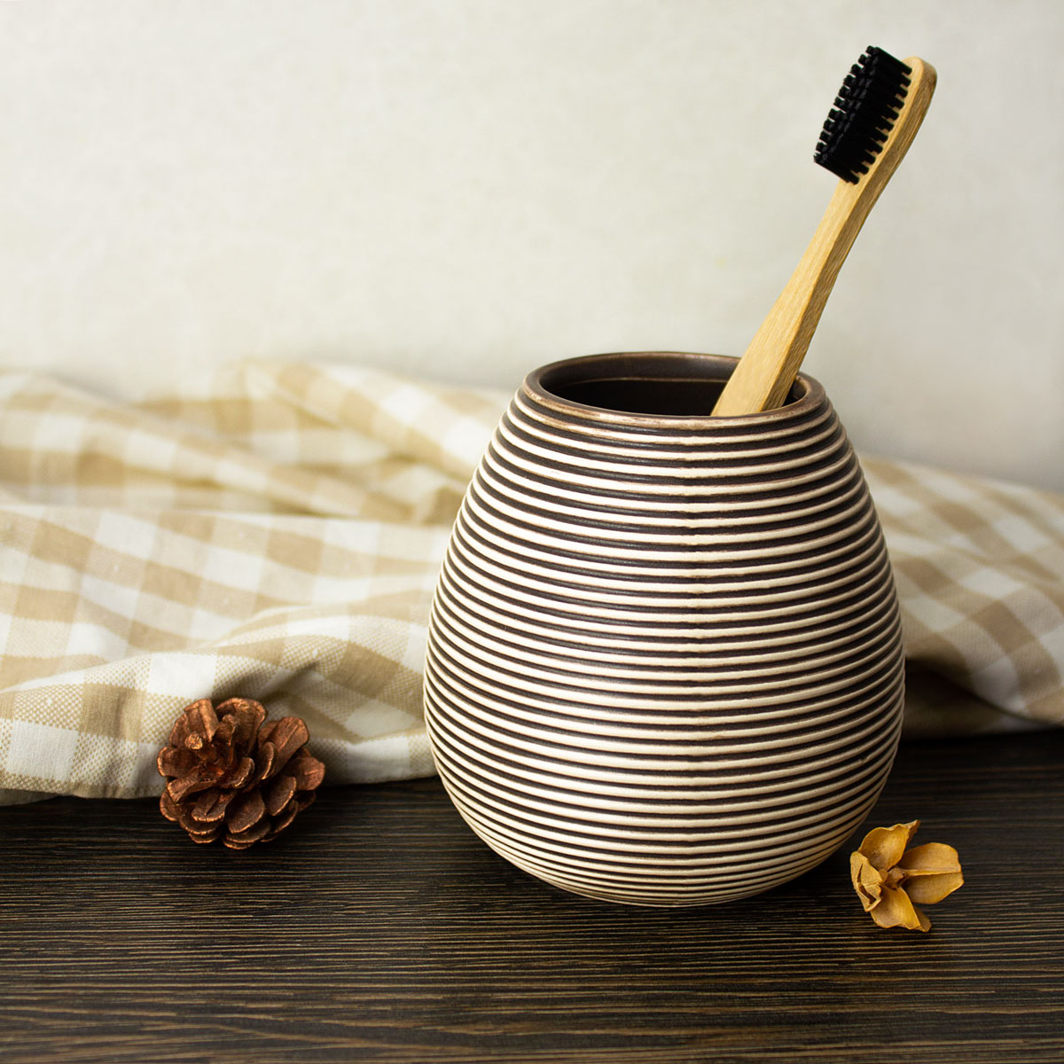 Керамический стакан будет гармонично смотреться на столешнице или раковине в ванной современного или классического стиля.Данный аксессуар выполнен из керамики. Керамическая поверхность легко очищается и моется. В стакане для ванной комнаты можно хранить зубные щетки с пастой или же другие необходимые вещи – кисти для макияжа, расчески или бритвенные станки. Подобрав другие аксессуары в едином стиле из нашей коллекции, вы сможете придать своей ванной комнате неповторимый вид.