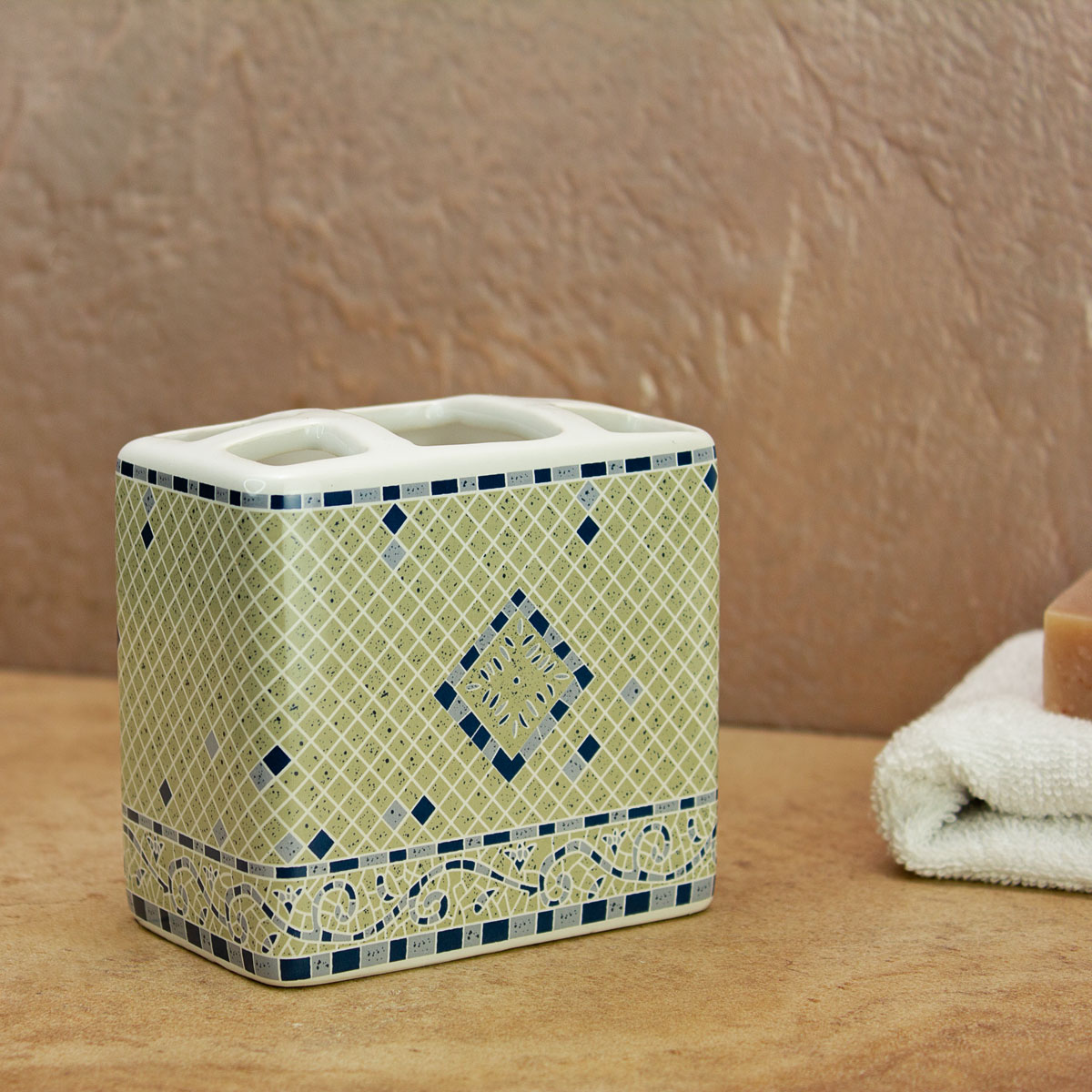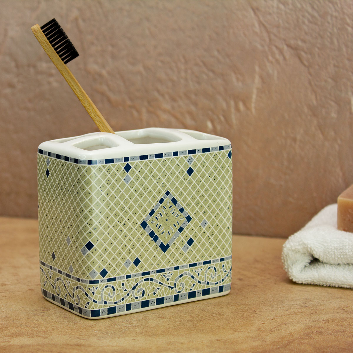Керамический стакан для зубных щеток будет гармонично смотреться на столешнице или раковине в ванной современного или классического стиля.Данный аксессуар выполнен из керамики. Керамическая поверхность легко очищается и моется. В стакане для ванной комнаты можно хранить зубные щетки с пастой или же другие необходимые вещи – кисти для макияжа, расчески или бритвенные станки. Подобрав другие аксессуары в едином стиле из нашей коллекции, вы сможете придать своей ванной комнате неповторимый вид.