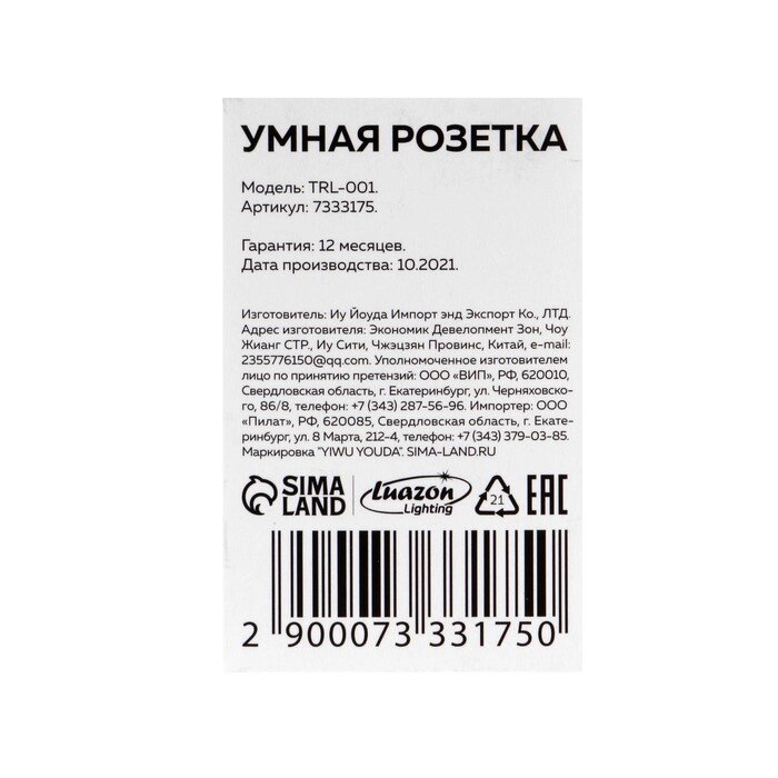 Умная розетка Wi-Fi Luazon Lighting, 16 А, 220 В