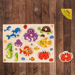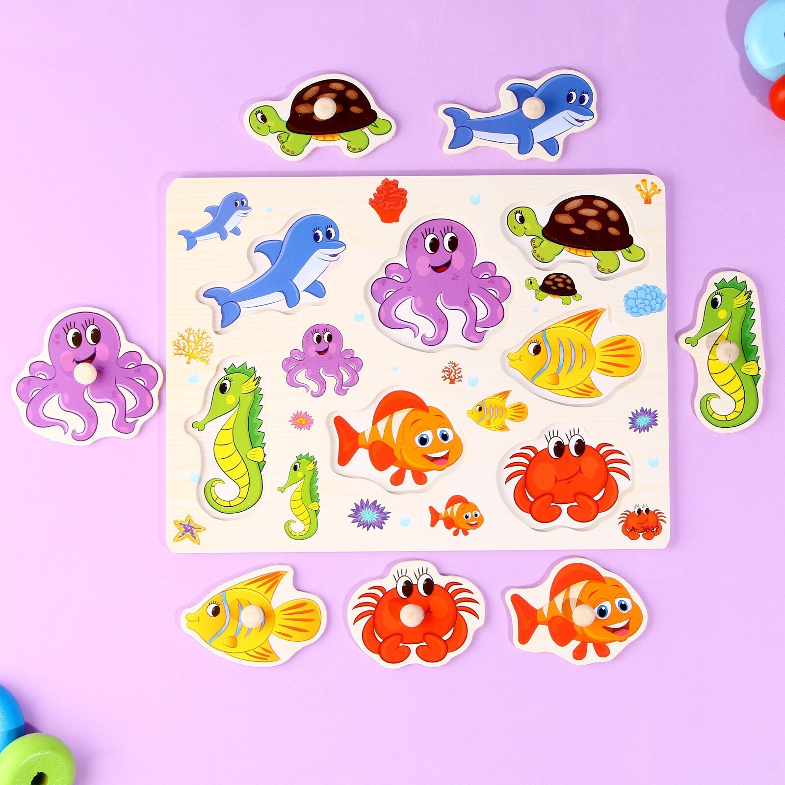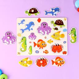 С помощью рамки-вкладыша ребёнок познакомится с обитателями подводного мира. Для большей продуктивности занимайтесь вместе с малышом, расскажите о среде обитания зверей и чем они питаются.