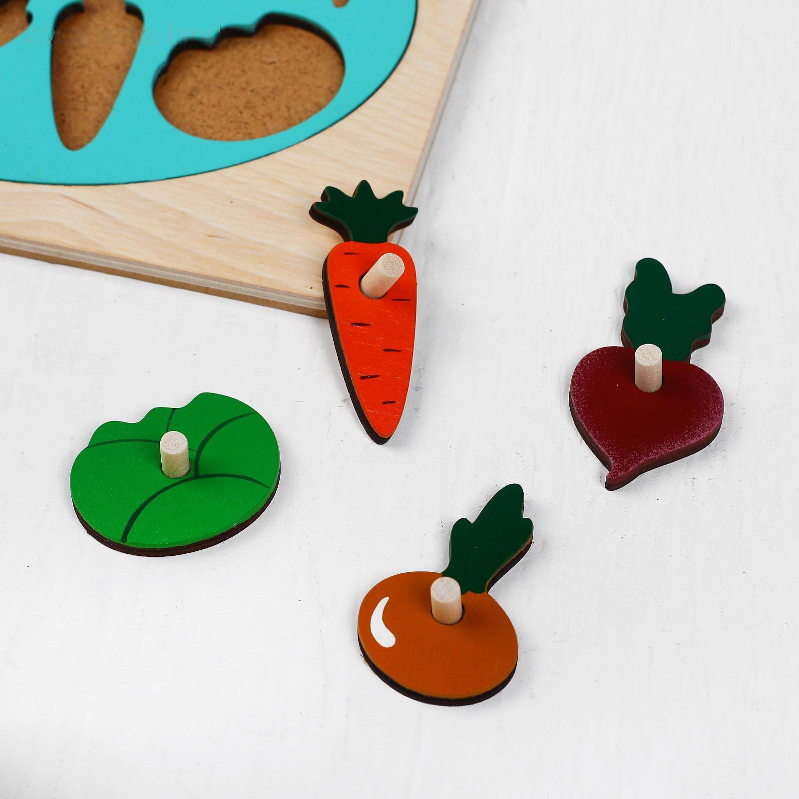 Игрушка выполнена в виде деревянной доски с углублениями в форме фруктов и овощей, в которые ребёнок будет вставлять вкладыши. На рамке расположены 2 тарелочки-подложки, которые не вынимаются из неё. Одна предназначена для овощей, а другая — для фруктов.
