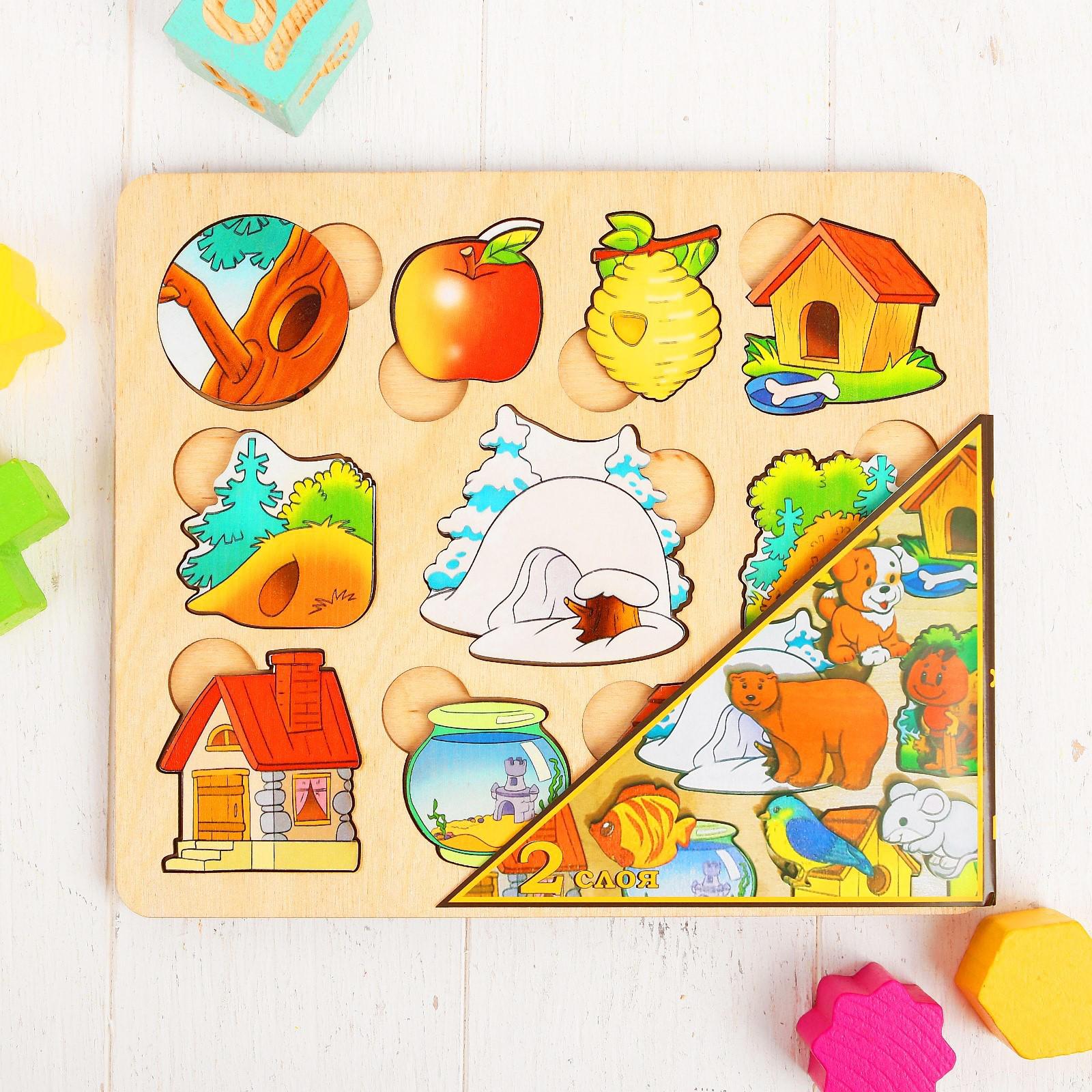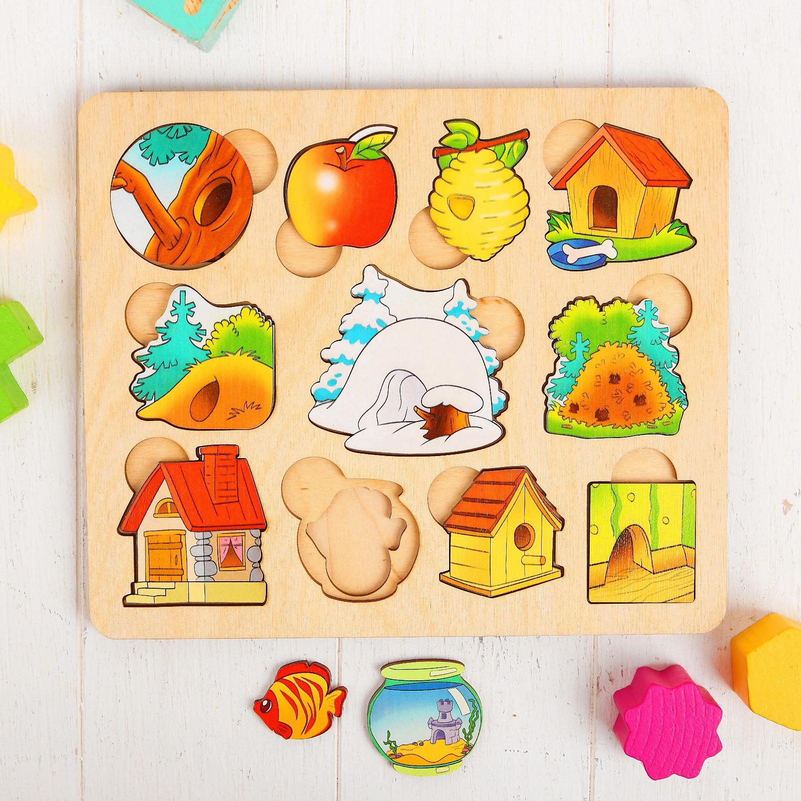 Развивающая доска «Где чей домик?» имеет два уровня вкладышей: первый — с жилищами зверушек, а второй — с самими жителями. Родители могут дополнить игру рассказами о животных, их среде обитания и пищевых предпочтениях, чтобы расширить кругозор малыша.