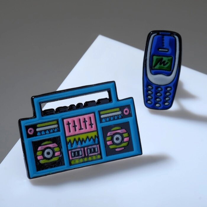 Набор значков (2шт) Магнитофон и телефон", цвет синий в чёрном металле