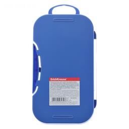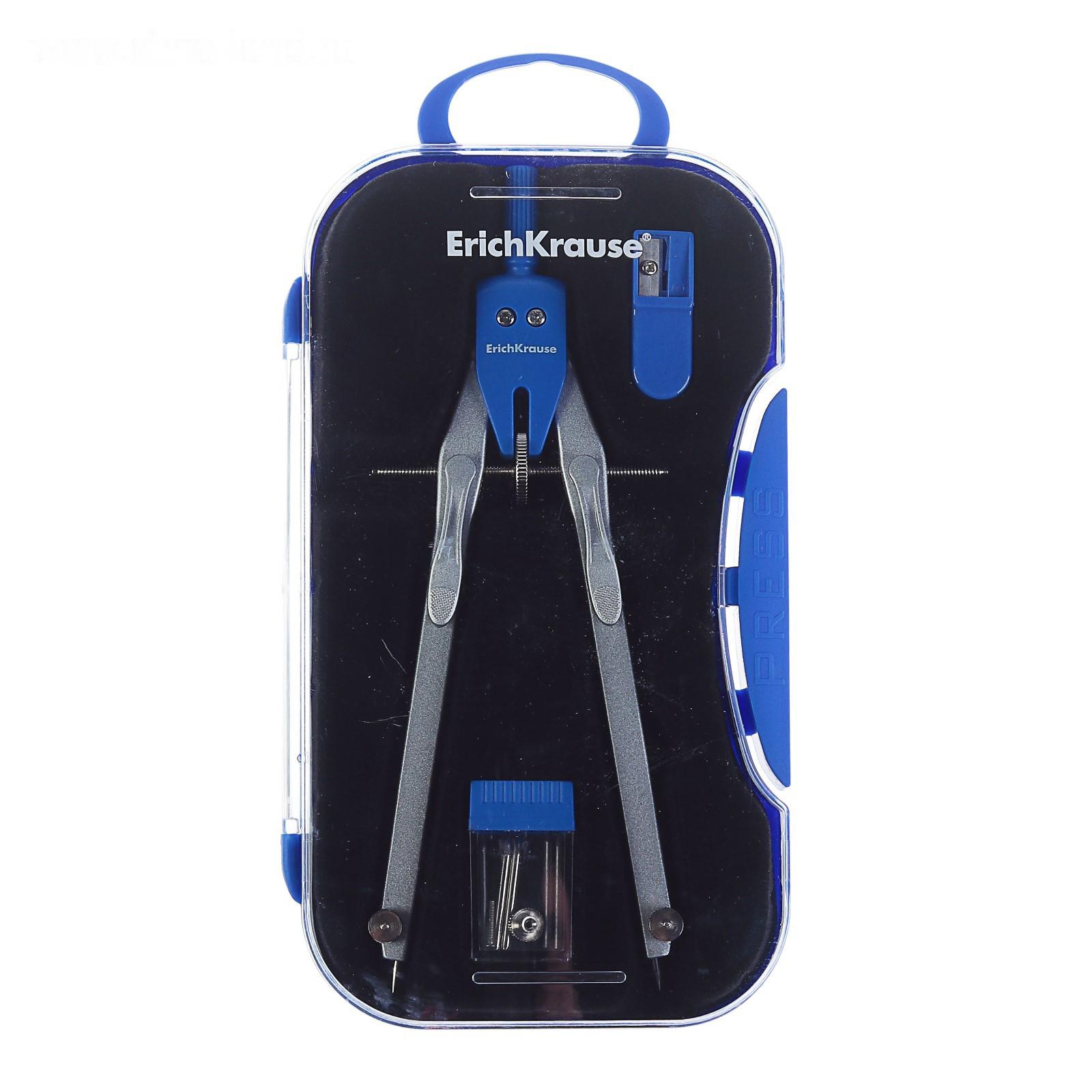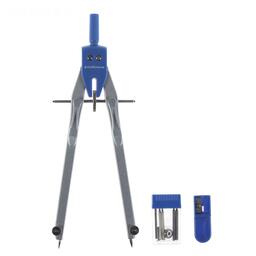 В комплект входят точный металлический циркуль с максимальным радиусом 18 см., точилка и набор запасных грифелей в пластиковом контейнере. Упакован в удобный пластиковый футляр с европодвесом.